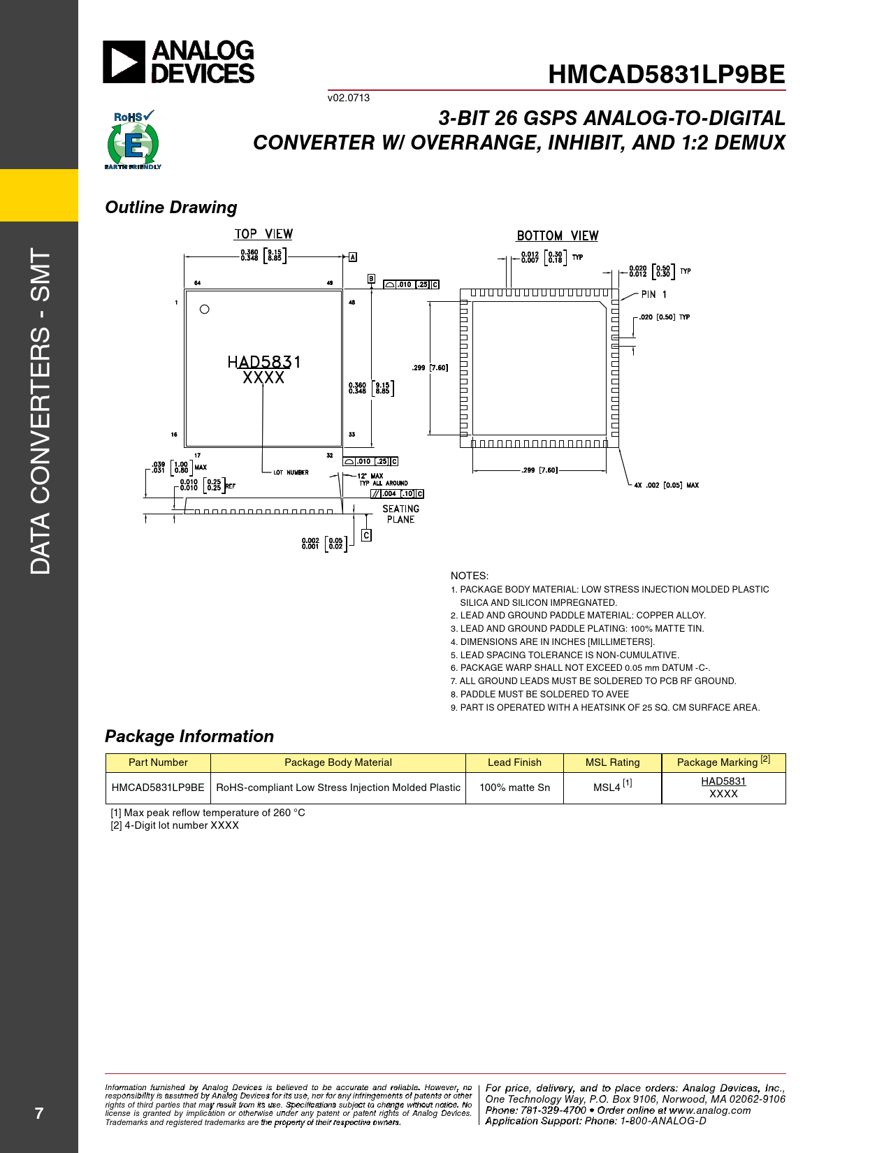 HMCAD5831LP9BE. 3-BIT 26 GSPS ANALOG-TO-DIGITAL. CONVERTER W/ OVERRANGE, INHIBIT, AND 1:2 DEMUX. Outline Drawing