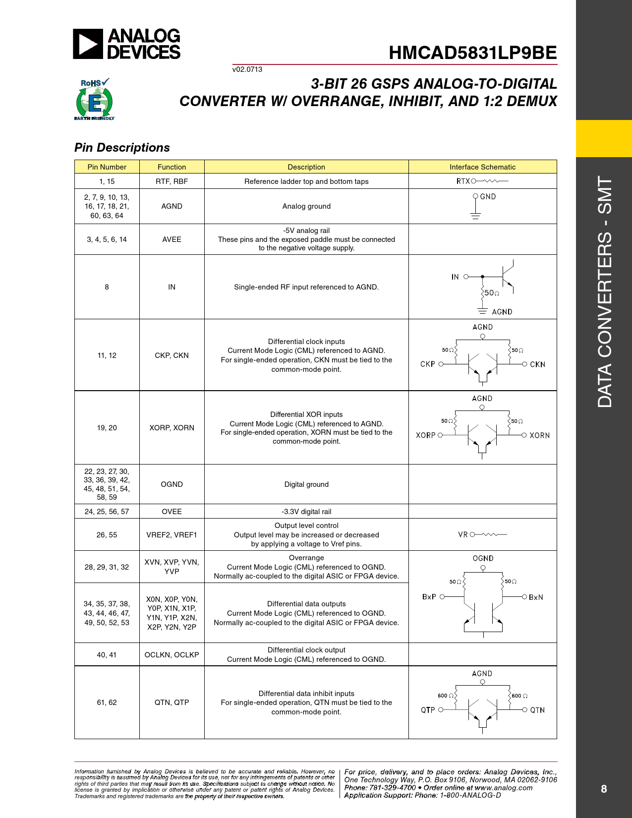 HMCAD5831LP9BE. 3-BIT 26 GSPS ANALOG-TO-DIGITAL. CONVERTER W/ OVERRANGE, INHIBIT, AND 1:2 DEMUX. Pin Descriptions