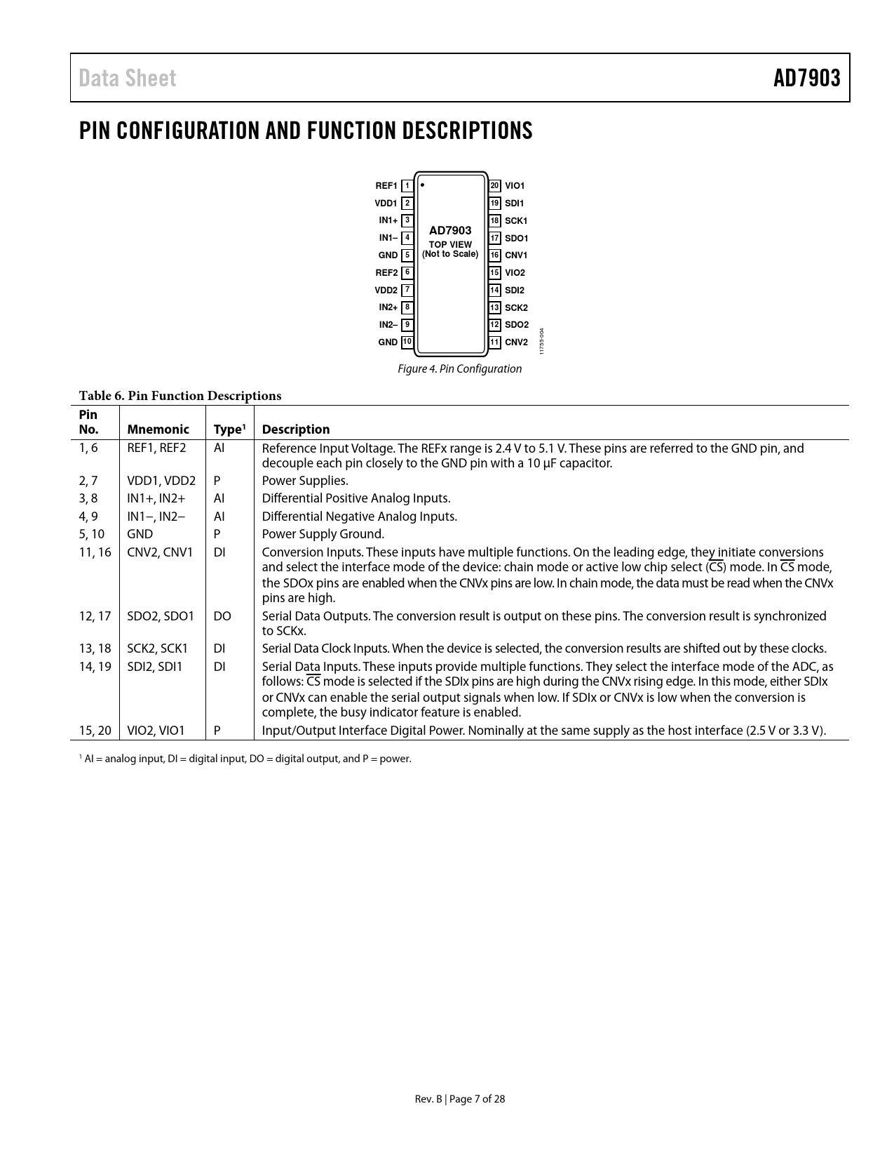 Data Sheet. AD7903. PIN CONFIGURATION AND FUNCTION DESCRIPTIONS. REF1 1. 20 VIO1. VDD1 2. 19 SDI1. IN1+ 3. 18 SCK1. IN1– 4. 17 SDO1. TOP VIEW