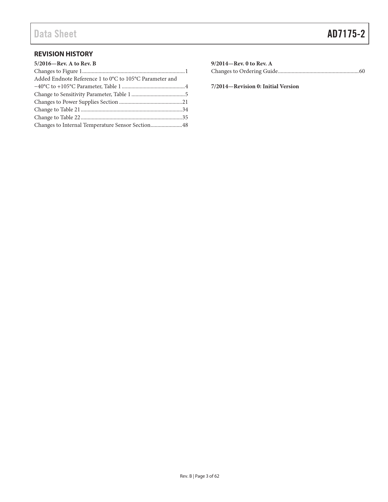 Change to Sensitivity Parameter, Table 1 ... 5 Changes to Power Supplies Section .. 21 Change to Table 21 .. 34 Change to Table 22 .. 35 Changes to Internal Temperature Sensor Section... 48 Rev. B | Page 3 of 62