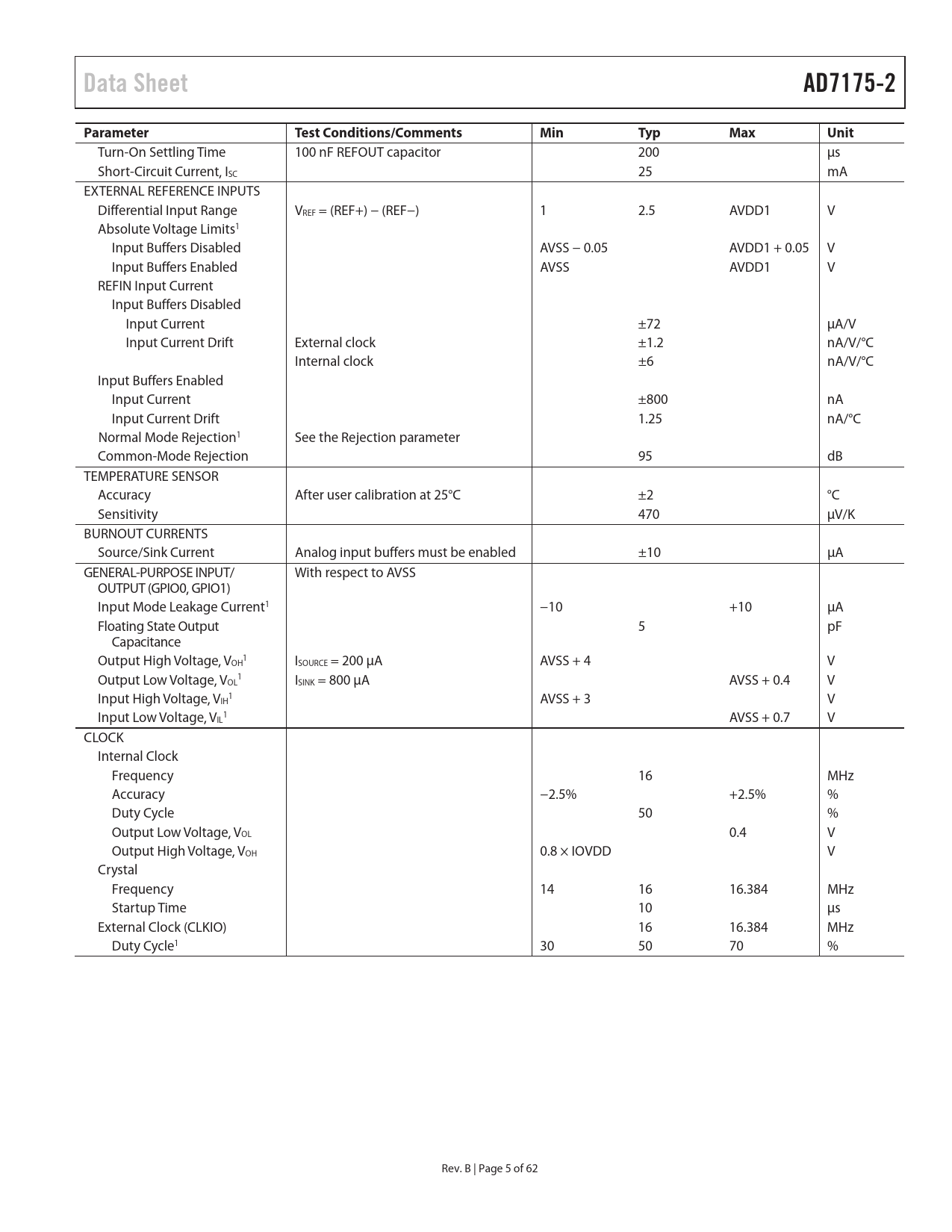 Turn-On Settling Time 100 nF REFOUT capacitor 200 µs Short-Circuit Current, ISC 25 mA EXTERNAL REFERENCE INPUTS Differential Input Range VREF = (REF+) − (REF−) 1 2.5 AVDD1 V Absolute Voltage Limits1 Input Buffers Disabled AVSS − 0.05 AVDD1 + 0.05 V Input Buffers Enabled AVSS AVDD1 V REFIN Input Current Input Buffers Disabled Input Current ±72 µA/V Input Current Drift External clock ±1.2 nA/V/°C Internal clock ±6 nA/V/°C Input Buffers Enabled Input Current ±800 nA Input Current Drift 1.25 nA/°C Normal Mode Rejection1 See the Rejection parameter Common-Mode Rejection 95 dB TEMPERATURE SENSOR Accuracy After user calibration at 25°C ±2 °C Sensitivity 470 µV/K BURNOUT CURRENTS Source/Sink Current Analog input buffers must be enabled ±10 µA GENERAL-PURPOSE INPUT/ With respect to AVSS OUTPUT (GPIO0, GPIO1) Input Mode Leakage Current1 −10 +10 µA Floating State Output 5 pF Capacitance Output High Voltage, V 1 OH ISOURCE = 200 µA AVSS + 4 V Output Low Voltage, V 1 OL ISINK = 800 µA AVSS + 0.4 V Input High Voltage, V 1 IH AVSS + 3 V Input Low Voltage, V 1 IL AVSS + 0.7 V CLOCK Internal Clock Frequency 16 MHz Accuracy −2.5% +2.5% % Duty Cycle 50 % Output Low Voltage, VOL 0.4 V Output High Voltage, VOH 0.8 × IOVDD V Crystal Frequency 14 16 16.384 MHz Startup Time 10 µs External Clock (CLKIO) 16 16.384 MHz Duty Cycle1 30 50 70 % Rev. B | Page 5 of 62