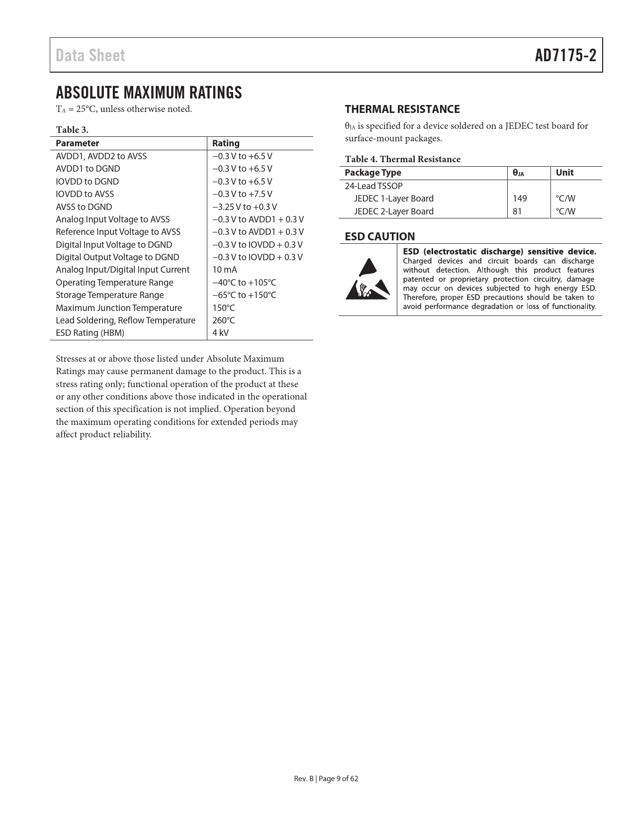 Data Sheet AD7175-2 ABSOLUTE MAXIMUM RATINGS TA = 25°C, unless otherwise noted. THERMAL RESISTANCETable 3. θJA is specified for a device soldered on a JEDEC test board for ParameterRating surface-mount packages. AVDD1, AVDD2 to AVSS −0.3 V to +6.5 V Table 4. Thermal Resistance AVDD1 to DGND −0.3 V to +6.5 V Package TypeθJAUnit IOVDD to DGND −0.3 V to +6.5 V 24-Lead TSSOP IOVDD to AVSS −0.3 V to +7.5 V JEDEC 1-Layer Board 149 °C/W AVSS to DGND −3.25 V to +0.3 V JEDEC 2-Layer Board 81 °C/W Analog Input Voltage to AVSS −0.3 V to AVDD1 + 0.3 V Reference Input Voltage to AVSS −0.3 V to AVDD1 + 0.3 V ESD CAUTION Digital Input Voltage to DGND −0.3 V to IOVDD + 0.3 V Digital Output Voltage to DGND −0.3 V to IOVDD + 0.3 V Analog Input/Digital Input Current 10 mA Operating Temperature Range −40°C to +105°C Storage Temperature Range −65°C to +150°C Maximum Junction Temperature 150°C Lead Soldering, Reflow Temperature 260°C ESD Rating (HBM) 4 kV Stresses at or above those listed under Absolute Maximum Ratings may cause permanent damage to the product. This is a stress rating only; functional operation of the product at these or any other conditions above those indicated in the operational section of this specification is not implied. Operation beyond the maximum operating conditions for extended periods may affect product reliability. Rev. B | Page 9 of 62