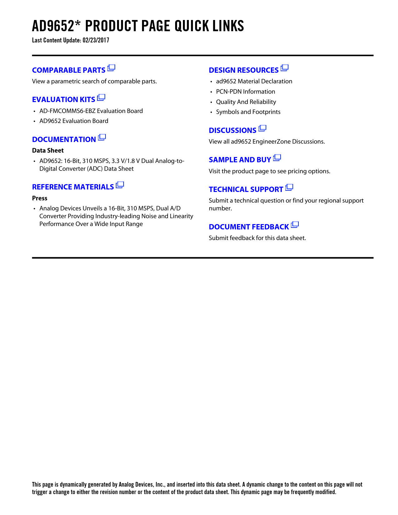 AD9652* PRODUCT PAGE QUICK LINKS Last Content Update: 02/23/2017COMPARABLE PARTSDESIGN RESOURCES View a parametric search of comparable parts. • ad9652 Material Declaration • PCN-PDN Information EVALUATION KITS • Quality And Reliability • AD-FMCOMMS6-EBZ Evaluation Board • Symbols and Footprints • AD9652 Evaluation Board DISCUSSIONSDOCUMENTATION View all ad9652 EngineerZone Discussions. Data Sheet • AD9652: 16-Bit, 310 MSPS, 3.3 V/1.8 V Dual Analog-to- SAMPLE AND BUY Digital Converter (ADC) Data Sheet Visit the product page to see pricing options. REFERENCE MATERIALSTECHNICAL SUPPORTPress Submit a technical question or find your regional support • Analog Devices Unveils a 16-Bit, 310 MSPS, Dual A/D number. Converter Providing Industry-leading Noise and Linearity Performance Over a Wide Input Range DOCUMENT FEEDBACK Submit feedback for this data sheet. This page is dynamically generated by Analog Devices, Inc., and inserted into this data sheet. A dynamic change to the content on this page will not trigger a change to either the revision number or the content of the product data sheet. This dynamic page may be frequently modified. Document Outline Features Applications Functional Block Diagram General Description Product Highlights Revision History Specifications ADC DC Specifications ADC AC Specifications Digital Specifications Switching Specifications Timing Specifications Timing Diagrams Absolute Maximum Ratings Thermal Characteristics ESD Caution Pin Configuration and Function Descriptions Typical Performance Characteristics Equivalent Circuits Theory of Operation ADC Architecture Analog Input Considerations Input Common Mode Common-Mode Voltage Servo Dither Large Signal Fast Fourier Transform Small Signal FFT Static Linearity Differential Input Configurations Voltage Reference Internal Reference Connection External Reference Operation Clock Input Considerations Clock Input Options Input Clock Divider Clock Duty Cycle Jitter Considerations Power Dissipation and Standby Mode Internal Background Calibration Digital Outputs Timing Data Clock Output ADC Overrange Fast Threshold Detection (FDA/FDB) Serial Port Interface Configuration Using the SPI Hardware Interface Configuration Without the SPI SPI Accessible Features Memory Map Reading the Memory Map Register Table Open and Reserved Locations Default Values Logic Levels Transfer Register Map Channel Specific Registers Memory Map Register Table Applications Information Design Guidelines Power and Ground Recommendations VCM RBIAS Reference Decoupling SPI Port Outline Dimensions Ordering Guide
