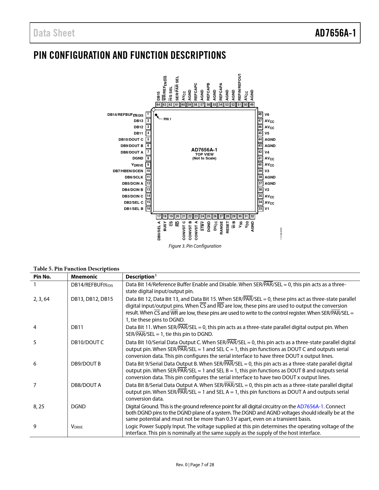 Data Sheet AD7656A-1 PIN CONFIGURATION AND FUNCTION DESCRIPTIONS S DI N/ SEL FOU /PA CAP FIN /S SEL DB15 SER 64 63 62 60 59 58