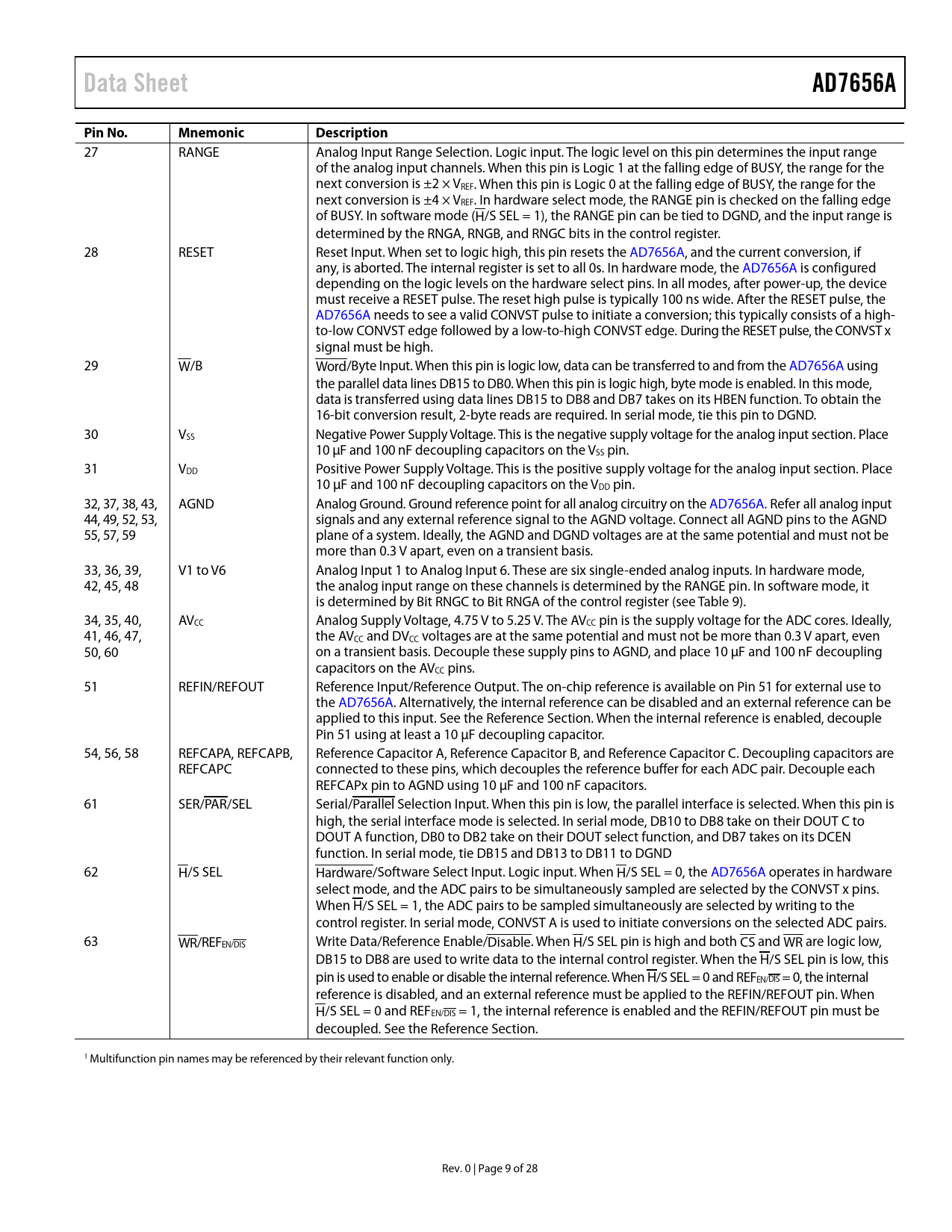 Data Sheet. AD7656A. Pin No. Mnemonic. Description