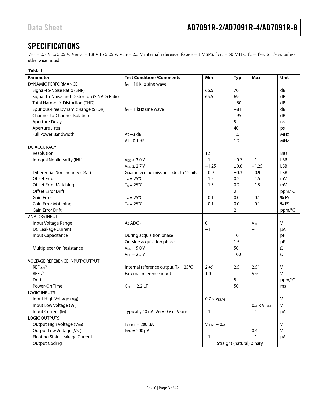 Data Sheet AD7091R-2/AD7091R-4/AD7091R-8 SPECIFICATIONS Table 1 Parameter Test Conditions/Comments Min Typ Max Unit