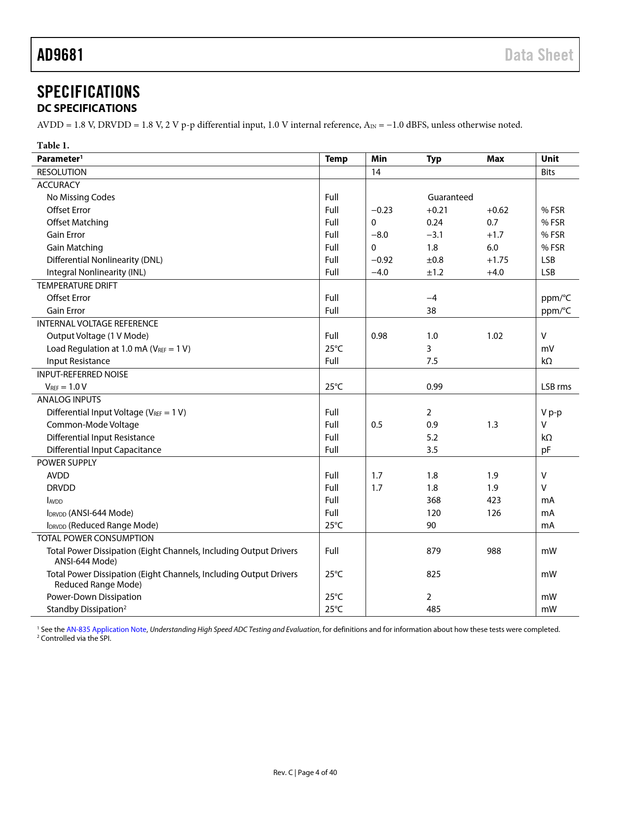 AD9681Data SheetSPECIFICATIONS DC SPECIFICATIONS AVDD = 1.8 V, DRVDD = 1.8 V, 2 V p-p differential input, 1.0 V internal reference, AIN = −1.0 dBFS, unless otherwise noted. Table 1. Parameter1 TempMinTypMaxUnit RESOLUTION 14 Bits ACCURACY No Missing Codes Full Guaranteed Offset Error Full −0.23 +0.21 +0.62 % FSR Offset Matching Full 0 0.24 0.7 % FSR Gain Error Full −8.0 −3.1 +1.7 % FSR Gain Matching Full 0 1.8 6.0 % FSR Differential Nonlinearity (DNL) Full −0.92 ±0.8 +1.75 LSB Integral Nonlinearity (INL) Full −4.0 ±1.2 +4.0 LSB TEMPERATURE DRIFT Offset Error Full −4 ppm/°C Gain Error Full 38 ppm/°C INTERNAL VOLTAGE REFERENCE Output Voltage (1 V Mode) Full 0.98 1.0 1.02 V Load Regulation at 1.0 mA (VREF = 1 V) 25°C 3 mV Input Resistance Full 7.5 kΩ INPUT-REFERRED NOISE VREF = 1.0 V 25°C 0.99 LSB rms ANALOG INPUTS Differential Input Voltage (VREF = 1 V) Full 2 V p-p Common-Mode Voltage Full 0.5 0.9 1.3 V Differential Input Resistance Full 5.2 kΩ Differential Input Capacitance Full 3.5 pF POWER SUPPLY AVDD Full 1.7 1.8 1.9 V DRVDD Full 1.7 1.8 1.9 V IAVDD Full 368 423 mA IDRVDD (ANSI-644 Mode) Full 120 126 mA IDRVDD (Reduced Range Mode) 25°C 90 mA TOTAL POWER CONSUMPTION Total Power Dissipation (Eight Channels, Including Output Drivers Full 879 988 mW ANSI-644 Mode) Total Power Dissipation (Eight Channels, Including Output Drivers 25°C 825 mW Reduced Range Mode) Power-Down Dissipation 25°C 2 mW Standby Dissipation2 25°C 485 mW 1 See the AN-835 Application Note, Understanding High Speed ADC Testing and Evaluation, for definitions and for information about how these tests were completed. 2 Controlled via the SPI. Rev. C | Page 4 of 40 Document Outline FEATURES APPLICATIONS GENERAL DESCRIPTION SIMPLIFIED FUNCTIONAL BLOCK DIAGRAM PRODUCT HIGHLIGHTS TABLE OF CONTENTS REVISION HISTORY FUNCTIONAL BLOCK DIAGRAM SPECIFICATIONS DC SPECIFICATIONS AC SPECIFICATIONS DIGITAL SPECIFICATIONS SWITCHING SPECIFICATIONS TIMING SPECIFICATIONS Timing Diagrams ABSOLUTE MAXIMUM RATINGS THERMAL CHARACTERISTICS ESD CAUTION PIN CONFIGURATION AND FUNCTION DESCRIPTIONS TYPICAL PERFORMANCE CHARACTERISTICS EQUIVALENT CIRCUITS THEORY OF OPERATION ANALOG INPUT CONSIDERATIONS Input Common Mode Differential Input Configurations VOLTAGE REFERENCE Internal Reference Connection External Reference Operation CLOCK INPUT CONSIDERATIONS Clock Input Options Input Clock Divider Clock Duty Cycle Jitter Considerations POWER DISSIPATION AND POWER-DOWN MODE DIGITAL OUTPUTS AND TIMING SDIO/OLM Pin SCLK/DTP Pin CSB1 and CSB2 Pins RBIAS1 and RBIAS2 Pins OUTPUT TEST MODES SERIAL PORT INTERFACE (SPI) CONFIGURATION USING THE SPI HARDWARE INTERFACE CONFIGURATION WITHOUT THE SPI SPI ACCESSIBLE FEATURES MEMORY MAP READING THE MEMORY MAP REGISTER TABLE Open Locations Default Values Logic Levels Channel Specific Registers MEMORY MAP MEMORY MAP REGISTER DESCRIPTIONS Device Index (Register 0x05) Transfer (Register 0xFF) Power Modes (Register 0x08) Enhancement Control (Register 0x0C) Output Mode (Register 0x14) Output Adjust (Register 0x15) Output Phase (Register 0x16) Serial Output Data Control (Register 0x21) Resolution/Sample Rate Override (Register 0x100) User I/O Control 2 (Register 0x101) User I/O Control 3 (Register 0x102) APPLICATIONS INFORMATION DESIGN GUIDELINES POWER AND GROUND RECOMMENDATIONS BOARD LAYOUT CONSIDERATIONS Sources of Coupling Crosstalk Between Inputs Coupling of Digital Output Switching Noise to Analog Inputs and Clock CLOCK STABILITY CONSIDERATIONS VCM REFERENCE DECOUPLING SPI PORT OUTLINE DIMENSIONS ORDERING GUIDE