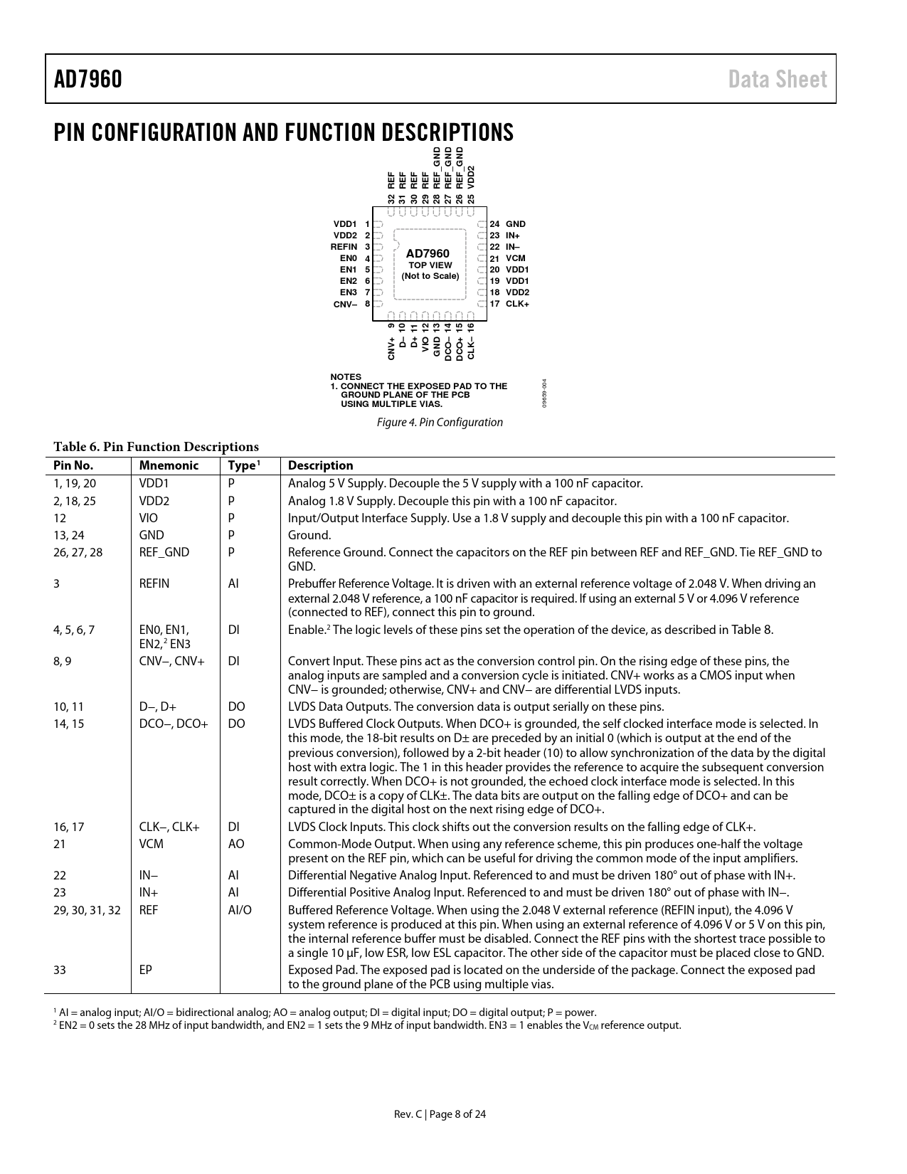 link to page 18 link to page 9 link to page 9 link to page 9 AD7960Data SheetPIN CONFIGURATION AND FUNCTION DESCRIPTIONSNDNDND_G_G_GFFFFFFFDD2REREREREREREREV3231302928272625VDD1 124 GNDVDD2 223 IN+REFIN 322 IN–AD7960EN0 421 VCMTOP VIEWEN1 520 VDD1(Not to Scale)EN2 619 VDD1EN3 718 VDD2CNV– 817 CLK+911011213141516+O–+D–D+VINDK–GCNVDCODCOCLNOTES 1. CONNECT THE EXPOSED PAD TO THE 004 GROUND PLANE OF THE PCB USING MULTIPLE VIAS. 09659- Figure 4. Pin Configuration Table 6. Pin Function Descriptions Pin No.MnemonicType1Description 1, 19, 20 VDD1 P Analog 5 V Supply. Decouple the 5 V supply with a 100 nF capacitor. 2, 18, 25 VDD2 P Analog 1.8 V Supply. Decouple this pin with a 100 nF capacitor. 12 VIO P Input/Output Interface Supply. Use a 1.8 V supply and decouple this pin with a 100 nF capacitor. 13, 24 GND P Ground. 26, 27, 28 REF_GND P Reference Ground. Connect the capacitors on the REF pin between REF and REF_GND. Tie REF_GND to GND. 3 REFIN AI Prebuffer Reference Voltage. It is driven with an external reference voltage of 2.048 V. When driving an external 2.048 V reference, a 100 nF capacitor is required. If using an external 5 V or 4.096 V reference (connected to REF), connect this pin to ground. 4, 5, 6, 7 EN0, EN1, DI Enable.2 The logic levels of these pins set the operation of the device, as described in Table 8. EN2,2 EN3 8, 9 CNV−, CNV+ DI Convert Input. These pins act as the conversion control pin. On the rising edge of these pins, the analog inputs are sampled and a conversion cycle is initiated. CNV+ works as a CMOS input when CNV− is grounded; otherwise, CNV+ and CNV− are differential LVDS inputs. 10, 11 D−, D+ DO LVDS Data Outputs. The conversion data is output serially on these pins. 14, 15 DCO−, DCO+ DO LVDS Buffered Clock Outputs. When DCO+ is grounded, the self clocked interface mode is selected. In this mode, the 18-bit results on D± are preceded by an initial 0 (which is output at the end of the previous conversion), followed by a 2-bit header (10) to allow synchronization of the data by the digital host with extra logic. The 1 in this header provides the reference to acquire the subsequent conversion result correctly. When DCO+ is not grounded, the echoed clock interface mode is selected. In this mode, DCO± is a copy of CLK±. The data bits are output on the falling edge of DCO+ and can be captured in the digital host on the next rising edge of DCO+. 16, 17 CLK−, CLK+ DI LVDS Clock Inputs. This clock shifts out the conversion results on the falling edge of CLK+. 21 VCM AO Common-Mode Output. When using any reference scheme, this pin produces one-half the voltage present on the REF pin, which can be useful for driving the common mode of the input amplifiers. 22 IN− AI Differential Negative Analog Input. Referenced to and must be driven 180° out of phase with IN+. 23 IN+ AI Differential Positive Analog Input. Referenced to and must be driven 180° out of phase with IN−. 29, 30, 31, 32 REF AI/O Buffered Reference Voltage. When using the 2.048 V external reference (REFIN input), the 4.096 V system reference is produced at this pin. When using an external reference of 4.096 V or 5 V on this pin, the internal reference buffer must be disabled. Connect the REF pins with the shortest trace possible to a single 10 μF, low ESR, low ESL capacitor. The other side of the capacitor must be placed close to GND. 33 EP Exposed Pad. The exposed pad is located on the underside of the package. Connect the exposed pad to the ground plane of the PCB using multiple vias. 1 AI = analog input; AI/O = bidirectional analog; AO = analog output; DI = digital input; DO = digital output; P = power. 2 EN2 = 0 sets the 28 MHz of input bandwidth, and EN2 = 1 sets the 9 MHz of input bandwidth. EN3 = 1 enables the VCM reference output. Rev. C | Page 8 of 24 Document Outline Features Applications Functional Block Diagram General Description Table of Contents Revision History Specifications Timing Specifications Timing Diagrams Absolute Maximum Ratings Thermal Resistance ESD Caution Pin Configuration and Function Descriptions Typical Performance Characteristics Terminology Theory of Operation Circuit Information Converter Information Transfer Function Analog Inputs Typical Applications Voltage Reference Options Wake-Up Time from Power-Down and Snooze Modes Power Supply Power-Up Digital Interface Conversion Control Echoed Clock Interface Mode Self Clocked Mode Applications Information Layout Evaluating AD7960 Performance Outline Dimensions Ordering Guide