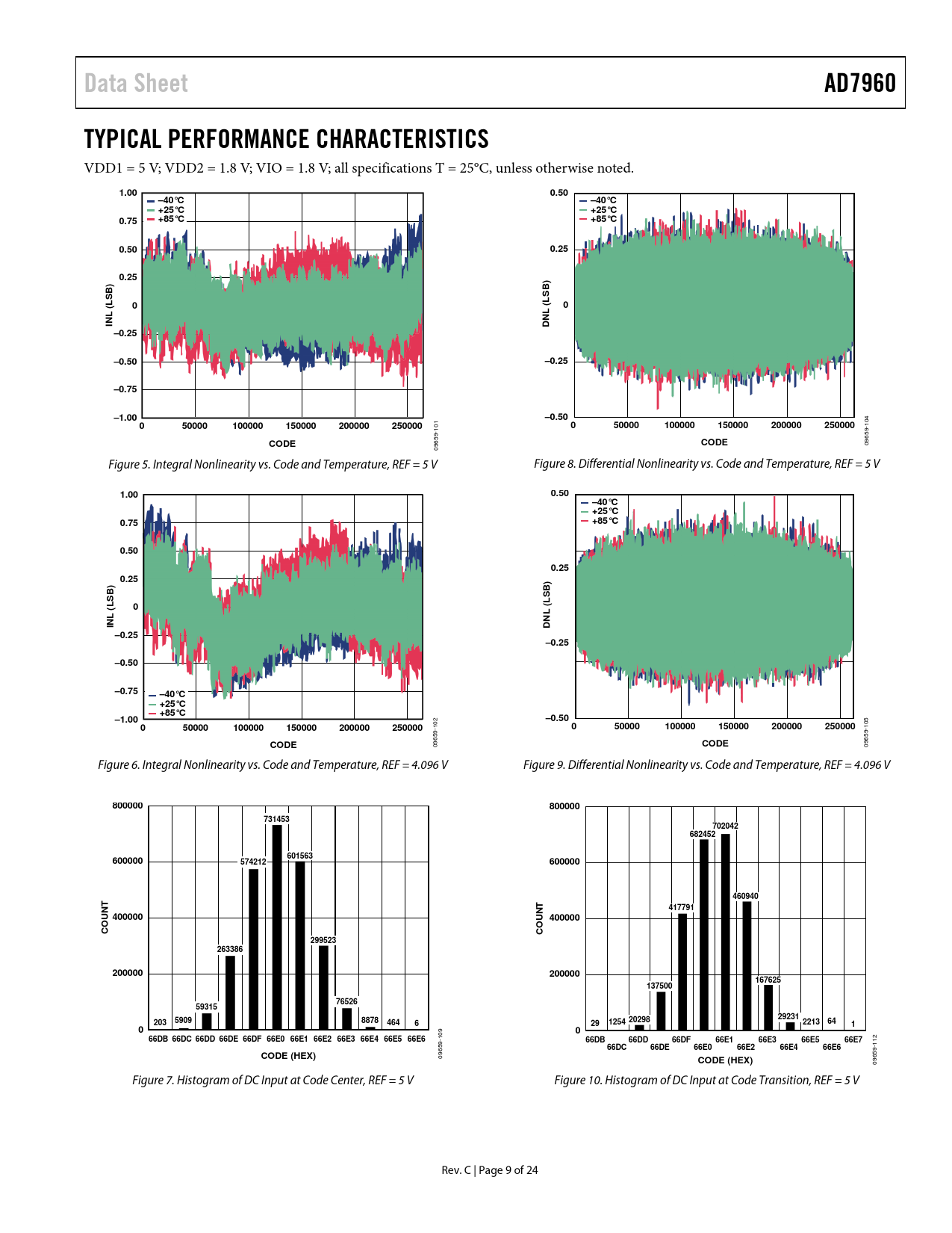 Data SheetAD7960TYPICAL PERFORMANCE CHARACTERISTICS VDD1 = 5 V; VDD2 = 1.8 V; VIO = 1.8 V; all specifications T = 25°C, unless otherwise noted. 1.000.50–40°C–40°C+25°C+25°C0.75+85°C+85°C0.500.250.25))SBSB0(L(L0LLINDN–0.25–0.50–0.25–0.75–1.00–0.50050000100000150000200000250000050000100000150000200000250000 104 101 CODECODE 09659- 09659- Figure 5. Integral Nonlinearity vs. Code and Temperature, REF = 5 V Figure 8. Differential Nonlinearity vs. Code and Temperature, REF = 5 V 1.000.50–40°C +25°C0.75+85°C0.500.250.25))SBSB0(L(LLLINDN–0.25–0.25–0.50–0.75–40°C +25°C +85°C–1.00–0.50050000100000150000200000250000 102 050000100000150000200000250000 105 CODE 09659- CODE 09659- Figure 6. Integral Nonlinearity vs. Code and Temperature, REF = 4.096 V Figure 9. Differential Nonlinearity vs. Code and Temperature, REF = 4.096 V 800000800000731453702042682452601563600000574212600000460940417791UNT 400000UNT 400000COCO2995232633862000002000001676251375007652659315292312035909887846420298629125422136410066DB 66DC 66DD 66DE 66DF 66E0 66E1 66E2 66E3 66E4 66E5 66E6 109 66DB66DD66DF66E166E366E566E7 112 66DC66DE66E066E266E466E6CODE (HEX) 09659- CODE (HEX) 09659- Figure 7. Histogram of DC Input at Code Center, REF = 5 V Figure 10. Histogram of DC Input at Code Transition, REF = 5 V Rev. C | Page 9 of 24 Document Outline Features Applications Functional Block Diagram General Description Table of Contents Revision History Specifications Timing Specifications Timing Diagrams Absolute Maximum Ratings Thermal Resistance ESD Caution Pin Configuration and Function Descriptions Typical Performance Characteristics Terminology Theory of Operation Circuit Information Converter Information Transfer Function Analog Inputs Typical Applications Voltage Reference Options Wake-Up Time from Power-Down and Snooze Modes Power Supply Power-Up Digital Interface Conversion Control Echoed Clock Interface Mode Self Clocked Mode Applications Information Layout Evaluating AD7960 Performance Outline Dimensions Ordering Guide