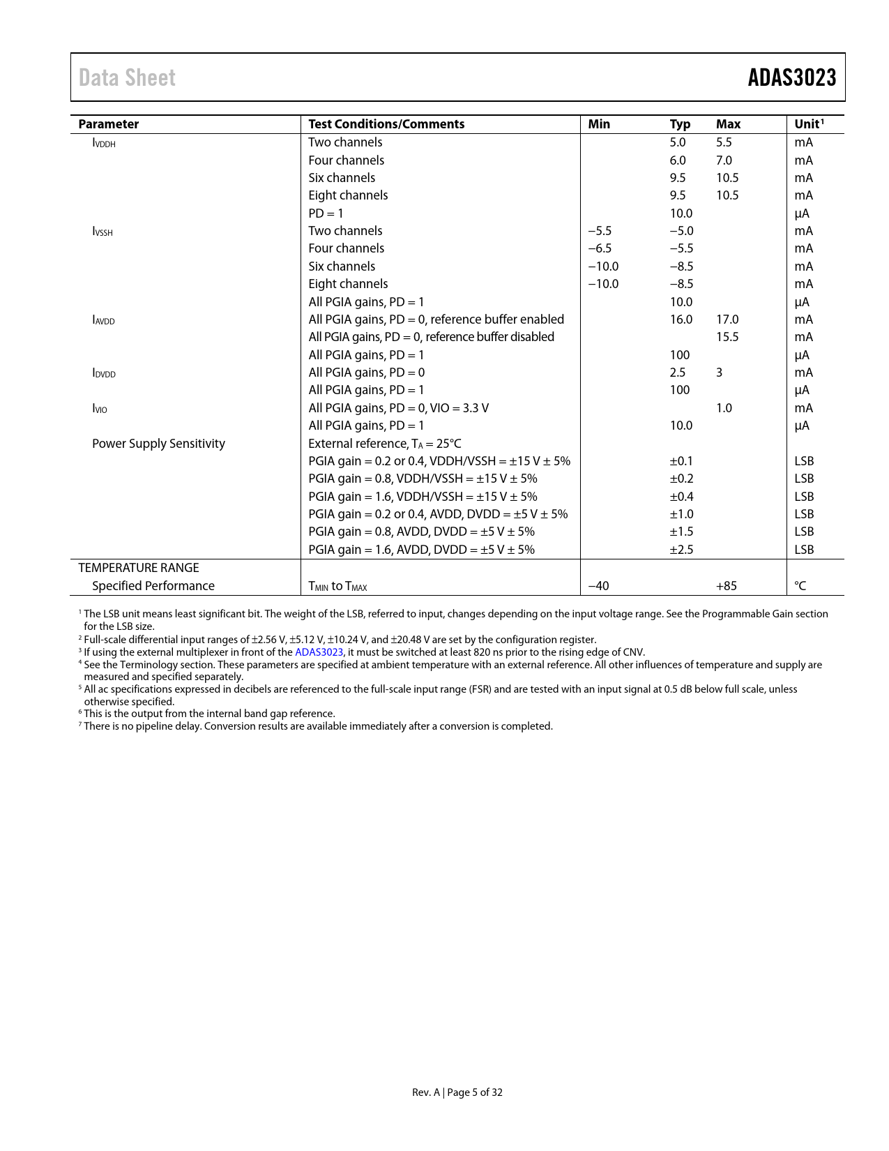 link to page 22 link to page 18 link to page 6 Data SheetADAS3023ParameterTest Conditions/CommentsMinTypMaxUnit1 IVDDH Two channels 5.0 5.5 mA Four channels 6.0 7.0 mA Six channels 9.5 10.5 mA Eight channels 9.5 10.5 mA PD = 1 10.0 µA IVSSH Two channels −5.5 −5.0 mA Four channels −6.5 −5.5 mA Six channels −10.0 −8.5 mA Eight channels −10.0 −8.5 mA All PGIA gains, PD = 1 10.0 µA IAVDD All PGIA gains, PD = 0, reference buffer enabled 16.0 17.0 mA All PGIA gains, PD = 0, reference buffer disabled 15.5 mA All PGIA gains, PD = 1 100 µA IDVDD All PGIA gains, PD = 0 2.5 3 mA All PGIA gains, PD = 1 100 µA IVIO All PGIA gains, PD = 0, VIO = 3.3 V 1.0 mA All PGIA gains, PD = 1 10.0 µA Power Supply Sensitivity External reference, TA = 25°C PGIA gain = 0.2 or 0.4, VDDH/VSSH = ±15 V ± 5% ±0.1 LSB PGIA gain = 0.8, VDDH/VSSH = ±15 V ± 5% ±0.2 LSB PGIA gain = 1.6, VDDH/VSSH = ±15 V ± 5% ±0.4 LSB PGIA gain = 0.2 or 0.4, AVDD, DVDD = ±5 V ± 5% ±1.0 LSB PGIA gain = 0.8, AVDD, DVDD = ±5 V ± 5% ±1.5 LSB PGIA gain = 1.6, AVDD, DVDD = ±5 V ± 5% ±2.5 LSB TEMPERATURE RANGE Specified Performance TMIN to TMAX −40 +85 °C 1 The LSB unit means least significant bit. The weight of the LSB, referred to input, changes depending on the input voltage range. See the Programmable Gain section for the LSB size. 2 Full-scale differential input ranges of ±2.56 V, ±5.12 V, ±10.24 V, and ±20.48 V are set by the configuration register. 3 If using the external multiplexer in front of the ADAS3023, it must be switched at least 820 ns prior to the rising edge of CNV. 4 See the Terminology section. These parameters are specified at ambient temperature with an external reference. All other influences of temperature and supply are measured and specified separately. 5 All ac specifications expressed in decibels are referenced to the full-scale input range (FSR) and are tested with an input signal at 0.5 dB below full scale, unless otherwise specified. 6 This is the output from the internal band gap reference. 7 There is no pipeline delay. Conversion results are available immediately after a conversion is completed. Rev. A | Page 5 of 32 Document Outline Features Applications Functional Block Diagram General Description Table of Contents Revision History Specifications Timing Specifications Circuit and Voltage Diagrams Timing Diagrams Absolute Maximum Ratings ESD Caution Pin Configuration and Function Descriptions Typical Performance Characteristics Terminology Theory of Operation Overview Operation Transfer Functions Typical Application Connection Diagram Analog Inputs Input Structure Programmable Gain Common-Mode Operating Range Single-Ended Signals with a Nonzero DC Offset (Asymmetrical) Single-Ended Signals with a 0 V DC Offset (Symmetrical) Voltage Reference Input/Output Internal Reference External Reference and Internal Buffer External Reference Reference Decoupling Power Supply Core Supplies High Voltage Supplies Power Dissipation Modes Fully Operational Mode Power-Down Mode Conversion Modes Warp Mode (CMS = 0) Normal Mode (CMS = 1, Default) Digital Interface Conversion Control CNV Rising--Start of Conversion (SOC) BUSY/SDO2 Falling Edge—End of Conversion (EOC) Register Pipeline RESET and Power-Down (PD) Inputs Serial Data Interface General Timing Configuration Register Packaging and Ordering Information Outline Dimensions Ordering Guide