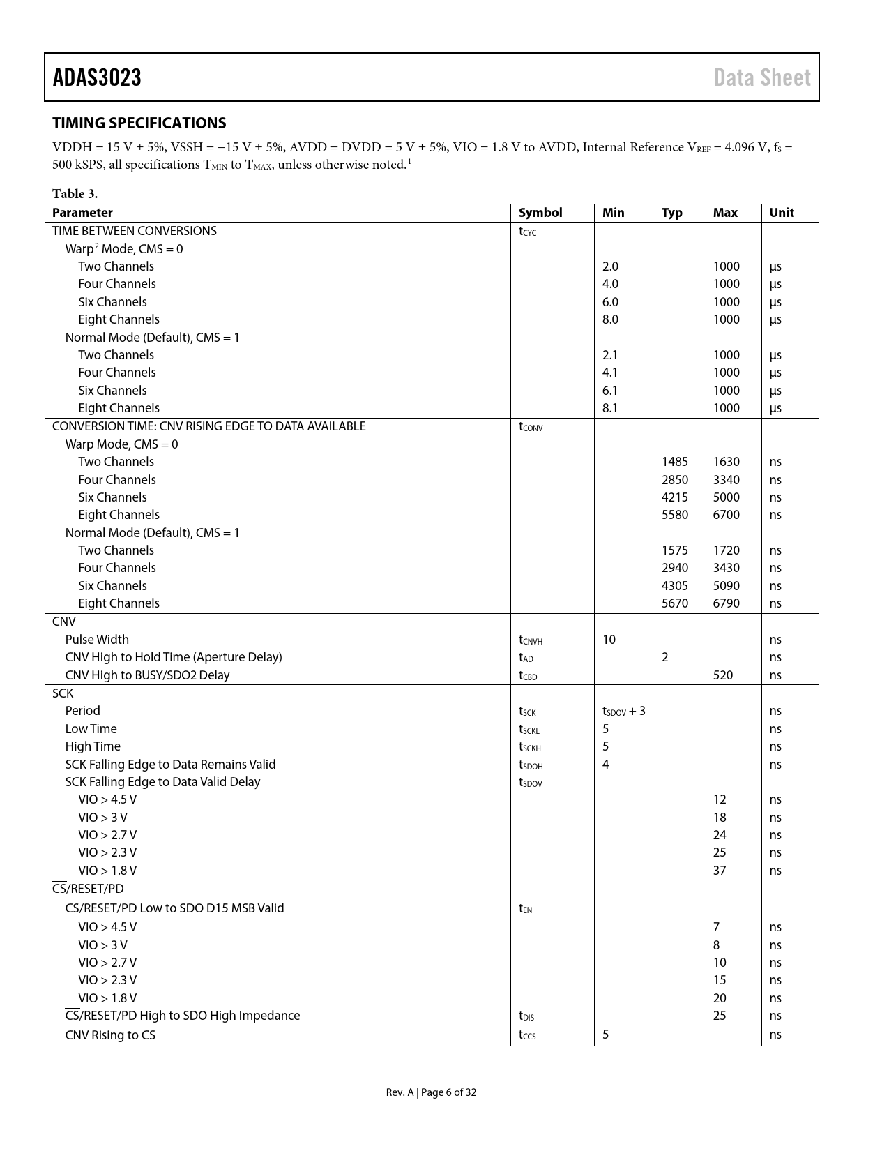 ADAS3023. Data Sheet. TIMING SPECIFICATIONS. Table 3. Parameter. Symbol. Min. Typ. Max. Unit