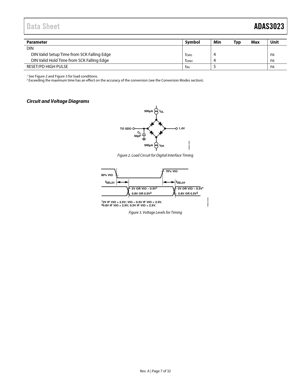 Data Sheet. ADAS3023. Parameter. Symbol. Min. Typ. Max. Unit. Circuit and Voltage Diagrams. 500µA. IOL. TO SDO. 1.4V. 50pF. IOH. 70% VIO. 30% VIO. tDELAY