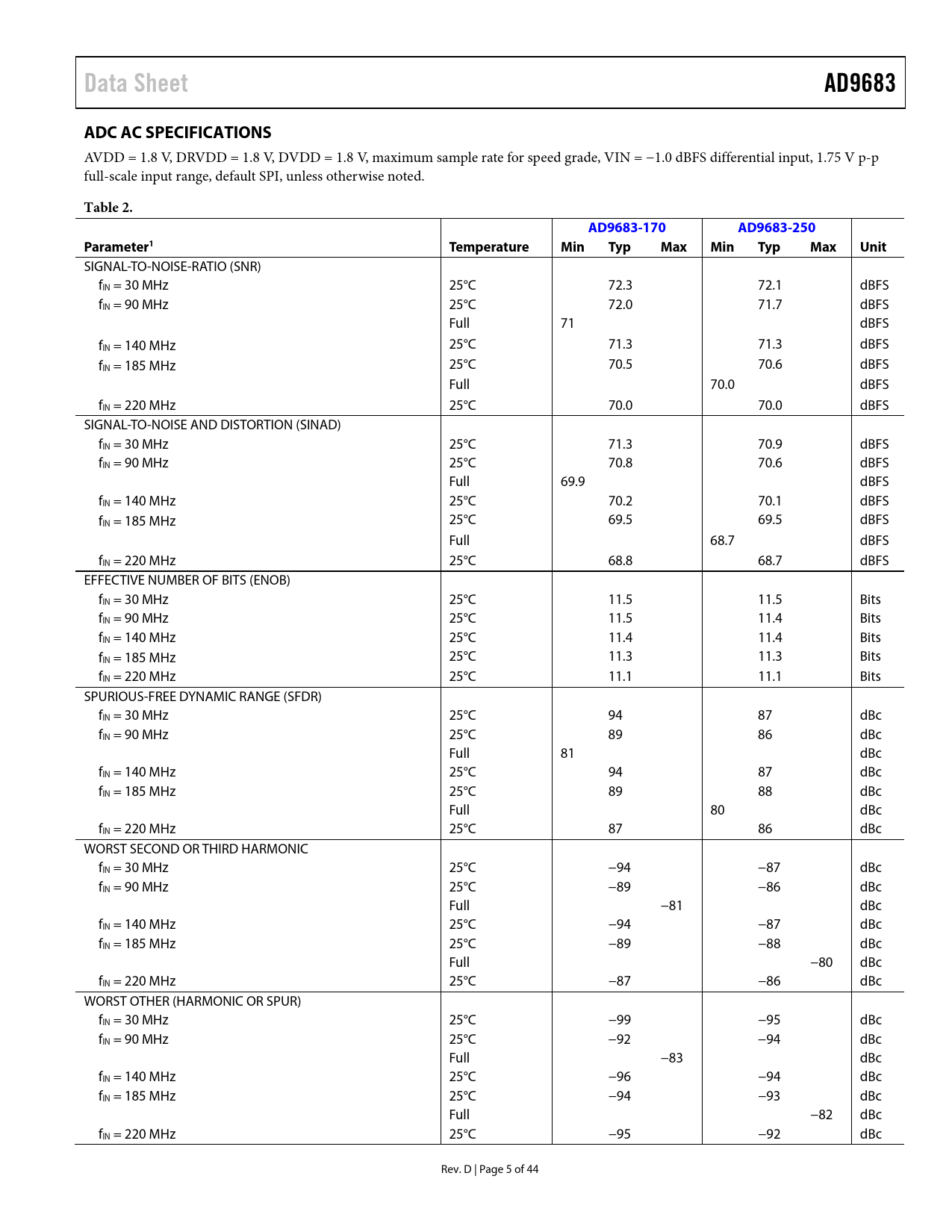 Data Sheet. AD9683. ADC AC SPECIFICATIONS. Table 2. AD9683-170. AD9683-250. Parameter1. Temperature. Min. Typ. Max. Unit