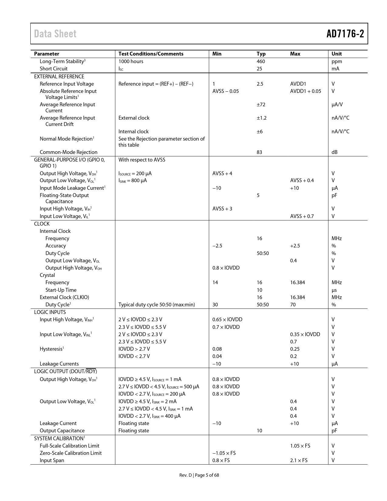 | Seiten / Seite | 69 / 6 — Data Sheet. AD7176-2. Parameter. Test Conditions/Comments. Min. Typ. Max. … |