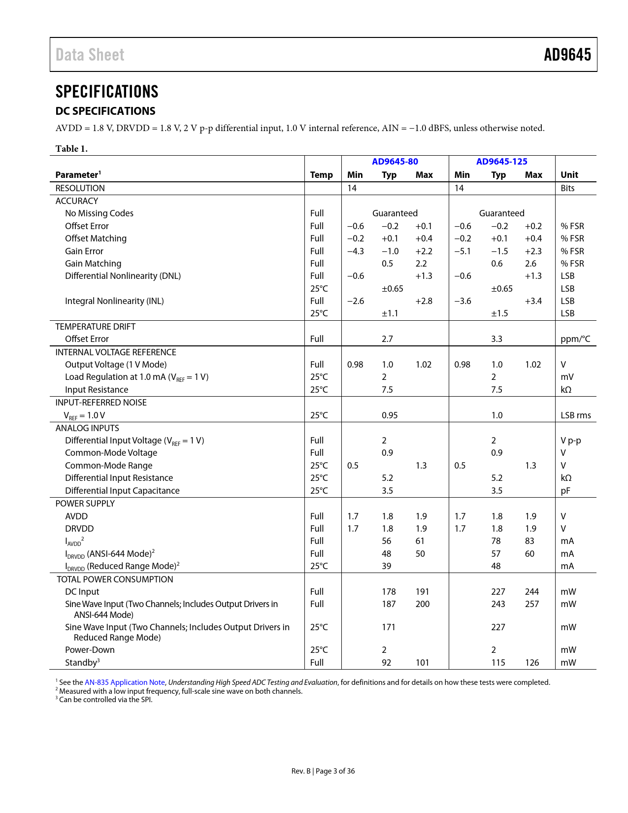 Data Sheet AD9645 SPECIFICATIONS DC SPECIFICATIONS Table 1 AD9645-80 AD9645-125 Parameter1 Temp Min Typ Max Unit
