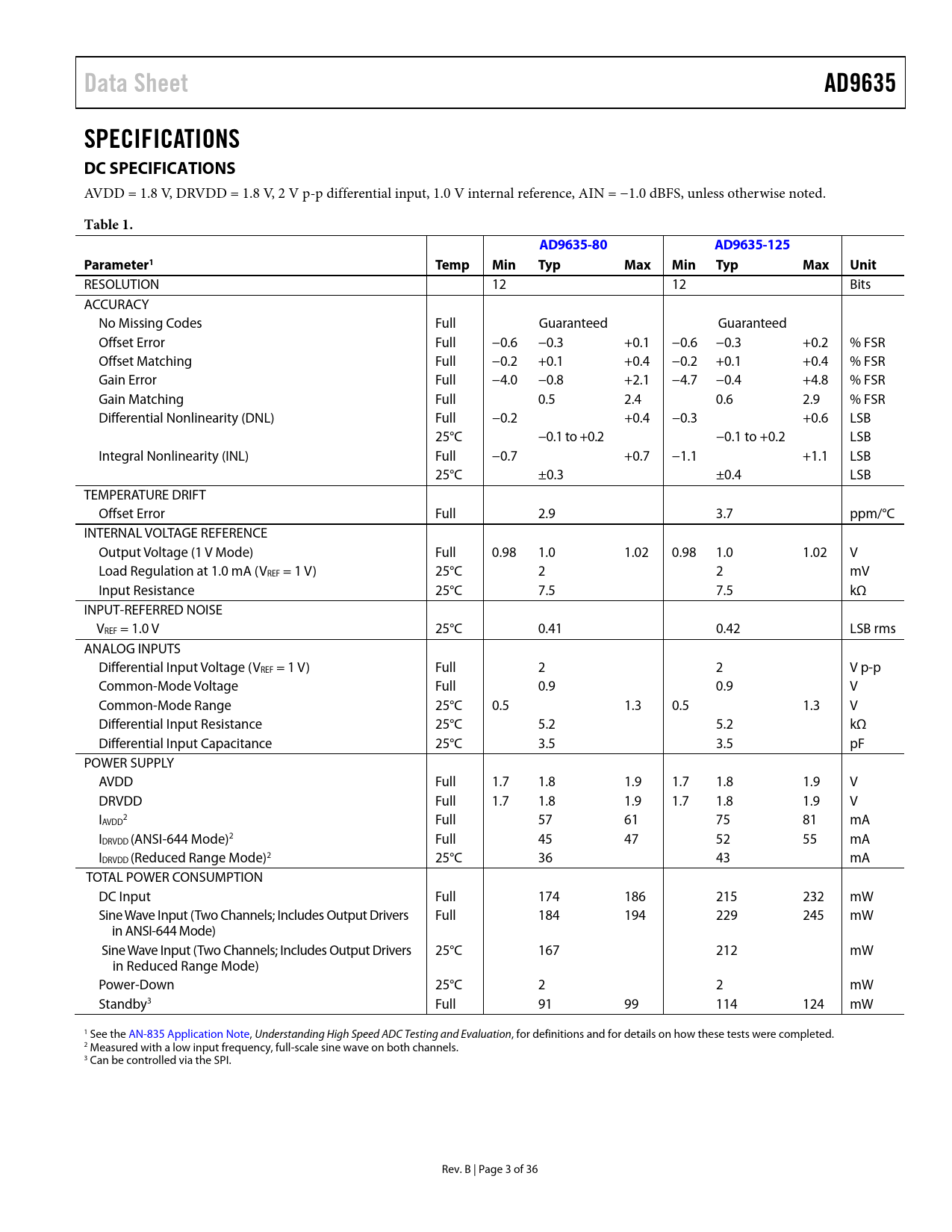 Data Sheet AD9635 SPECIFICATIONS DC SPECIFICATIONS Table 1 AD9635-80 AD9635-125 Parameter1 Temp Min Typ Max Unit