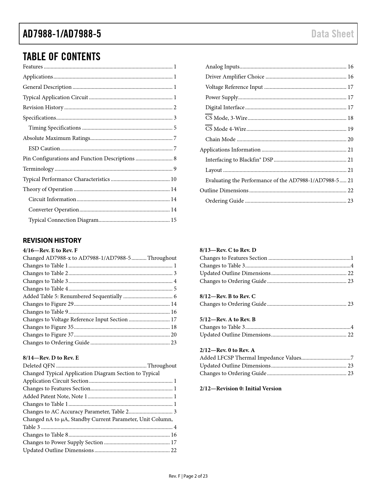 link to page 1 link to page 1 link to page 1 link to page 1 link to page 2 link to page 3 link to page 5 link to page 7 link to page 7 link to page 8 link to page 9 link to page 10 link to page 14 link to page 14 link to page 14 link to page 15 link to page 16 link to page 16 link to page 17 link to page 17 link to page 17 link to page 18 link to page 19 link to page 20 link to page 21 link to page 21 link to page 21 link to page 21 link to page 22 link to page 23 AD7988-1/AD7988-5Data SheetTABLE OF CONTENTS Features .. 1 Analog Inputs.. 16 Applications ... 1 Driver Amplifier Choice ... 16 General Description ... 1 Voltage Reference Input .. 17 Typical Application Circuit ... 1 Power Supply ... 17 Revision History ... 2 Digital Interface .. 17 Specifications ... 3 CS Mode, 3-Wire .. 18 Timing Specifications .. 5 CS Mode 4-Wire ... 19 Absolute Maximum Ratings .. 7 Chain Mode .. 20 ESD Caution .. 7 Applications Information .. 21 Pin Configurations and Function Descriptions ... 8 Interfacing to Blackfin® DSP ... 21 Terminology .. 9 Layout .. 21 Typical Performance Characteristics ... 10 Evaluating the Performance of the AD7988-1/AD7988-5 ... 21 Theory of Operation .. 14 Outline Dimensions ... 22 Circuit Information .. 14 Ordering Guide .. 23 Converter Operation .. 14 Typical Connection Diagram.. 15 REVISION HISTORY 4/16—Rev. E to Rev. F8/13—Rev. C to Rev. D Changed AD7988-x to AD7988-1/AD7988-5 ... Throughout Changes to Features Section .. 1 Changes to Table 1 .. 1 Changes to Table 3 ... 4 Changes to Table 2 .. 3 Updated Outline Dimensions ... 22 Changes to Table 3 .. 4 Changes to Ordering Guide .. 23 Changes to Table 4 .. 5 Added Table 5: Renumbered Sequential y .. 6 8/12—Rev. B to Rev. C Changes to Figure 29 .. 14 Changes to Ordering Guide .. 23 Changes to Table 9 .. 16 Changes to Voltage Reference Input Section .. 17 5/12—Rev. A to Rev. B Changes to Figure 35 .. 18 Changes to Table 3 ... 4 Changes to Figure 37 .. 20 Updated Outline Dimensions ... 22 Changes to Ordering Guide .. 23 2/12—Rev. 0 to Rev. A8/14—Rev. D to Rev. E Added LFCSP Thermal Impedance Values .. 7 Deleted QFN .. Throughout Updated Outline Dimensions ... 23 Changed Typical Application Diagram Section to Typical Changes to Ordering Guide .. 23 Application Circuit Section ... 1 Changes to Features Section.. 1 2/12—Revision 0: Initial Version Added Patent Note, Note 1 .. 1 Changes to Table 1 .. 1 Changes to AC Accuracy Parameter, Table 2 .. 3 Changed nA to µA, Standby Current Parameter, Unit Column, Table 3 .. 4 Changes to Table 8 .. 16 Changes to Power Supply Section .. 17 Updated Outline Dimensions ... 22 Rev. F | Page 2 of 23 Document Outline FEATURES APPLICATIONS GENERAL DESCRIPTION TYPICAL APPLICATION CIRCUIT TABLE OF CONTENTS REVISION HISTORY SPECIFICATIONS TIMING SPECIFICATIONS ABSOLUTE MAXIMUM RATINGS ESD CAUTION PIN CONFIGURATIONS AND FUNCTION DESCRIPTIONS TERMINOLOGY TYPICAL PERFORMANCE CHARACTERISTICS THEORY OF OPERATION CIRCUIT INFORMATION CONVERTER OPERATION Transfer Functions TYPICAL CONNECTION DIAGRAM ANALOG INPUTS DRIVER AMPLIFIER CHOICE VOLTAGE REFERENCE INPUT POWER SUPPLY DIGITAL INTERFACE MODE, 3-WIRE MODE 4-WIRE CHAIN MODE APPLICATIONS INFORMATION INTERFACING TO BLACKFIN® DSP LAYOUT EVALUATING THE PERFORMANCE OF THE AD7988-1/AD7988-5 OUTLINE DIMENSIONS ORDERING GUIDE