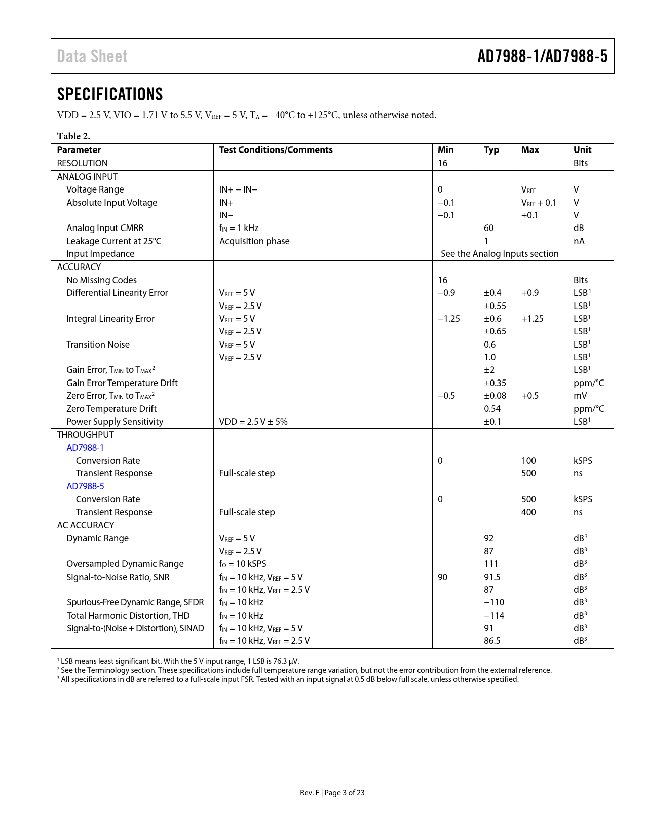 Data Sheet AD7988-1/AD7988-5 SPECIFICATIONS Table 2 Parameter Test Conditions/Comments Min Typ Max Unit