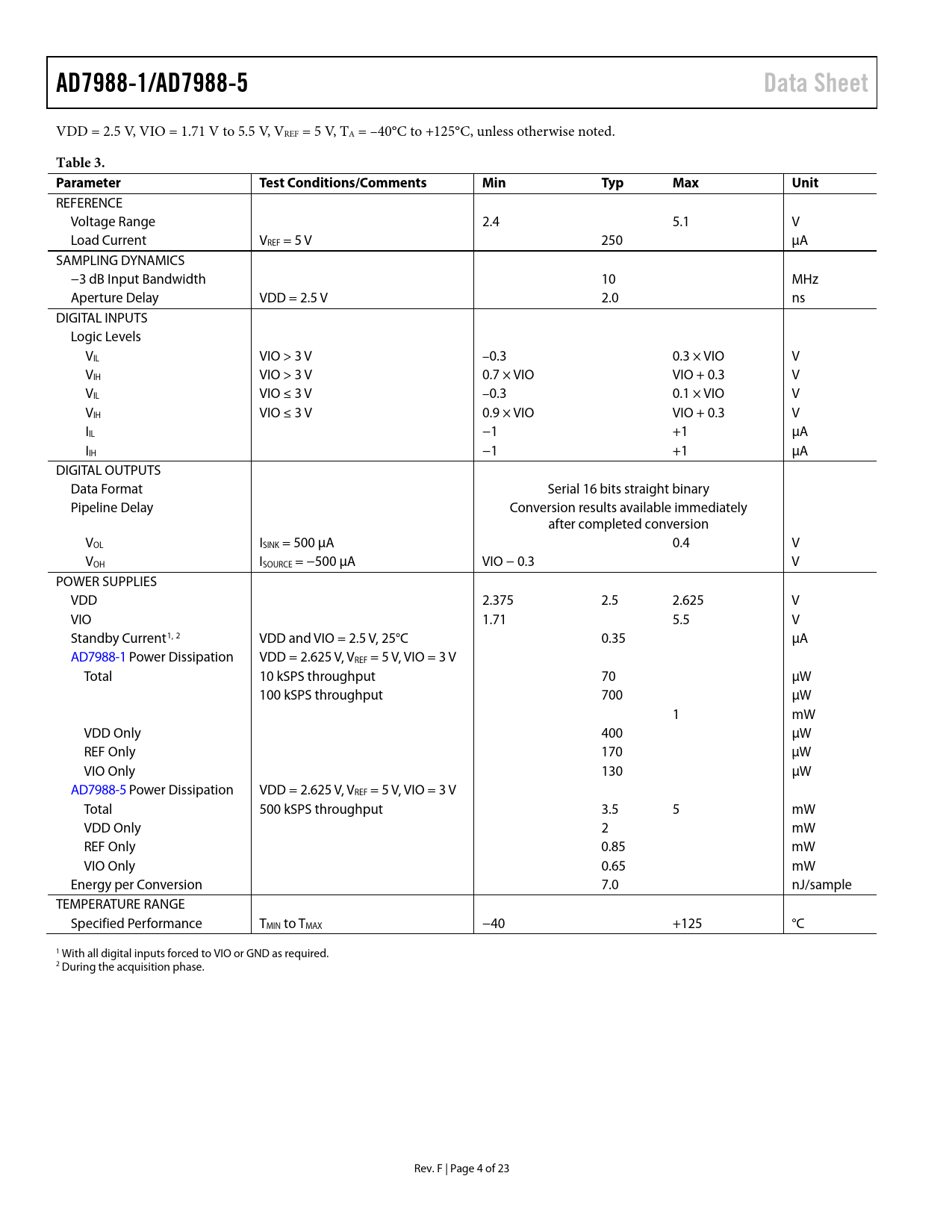 AD7988-1/AD7988-5Data Sheet VDD = 2.5 V, VIO = 1.71 V to 5.5 V, VREF = 5 V, TA = –40°C to +125°C, unless otherwise noted. Table 3. ParameterTest Conditions/CommentsMinTypMaxUnit REFERENCE Voltage Range 2.4 5.1 V Load Current VREF = 5 V 250 µA SAMPLING DYNAMICS −3 dB Input Bandwidth 10 MHz Aperture Delay VDD = 2.5 V 2.0 ns DIGITAL INPUTS Logic Levels VIL VIO > 3 V –0.3 0.3 × VIO V VIH VIO > 3 V 0.7 × VIO VIO + 0.3 V VIL VIO ≤ 3 V –0.3 0.1 × VIO V VIH VIO ≤ 3 V 0.9 × VIO VIO + 0.3 V IIL −1 +1 µA IIH −1 +1 µA DIGITAL OUTPUTS Data Format Serial 16 bits straight binary Pipeline Delay Conversion results available immediately after completed conversion VOL ISINK = 500 µA 0.4 V VOH ISOURCE = −500 µA VIO − 0.3 V POWER SUPPLIES VDD 2.375 2.5 2.625 V VIO 1.71 5.5 V Standby Current1, 2 VDD and VIO = 2.5 V, 25°C 0.35 µA AD7988-1 Power Dissipation VDD = 2.625 V, VREF = 5 V, VIO = 3 V Total 10 kSPS throughput 70 µW 100 kSPS throughput 700 µW 1 mW VDD Only 400 µW REF Only 170 µW VIO Only 130 µW AD7988-5 Power Dissipation VDD = 2.625 V, VREF = 5 V, VIO = 3 V Total 500 kSPS throughput 3.5 5 mW VDD Only 2 mW REF Only 0.85 mW VIO Only 0.65 mW Energy per Conversion 7.0 nJ/sample TEMPERATURE RANGE Specified Performance TMIN to TMAX −40 +125 °C 1 With all digital inputs forced to VIO or GND as required. 2 During the acquisition phase. Rev. F | Page 4 of 23 Document Outline FEATURES APPLICATIONS GENERAL DESCRIPTION TYPICAL APPLICATION CIRCUIT TABLE OF CONTENTS REVISION HISTORY SPECIFICATIONS TIMING SPECIFICATIONS ABSOLUTE MAXIMUM RATINGS ESD CAUTION PIN CONFIGURATIONS AND FUNCTION DESCRIPTIONS TERMINOLOGY TYPICAL PERFORMANCE CHARACTERISTICS THEORY OF OPERATION CIRCUIT INFORMATION CONVERTER OPERATION Transfer Functions TYPICAL CONNECTION DIAGRAM ANALOG INPUTS DRIVER AMPLIFIER CHOICE VOLTAGE REFERENCE INPUT POWER SUPPLY DIGITAL INTERFACE MODE, 3-WIRE MODE 4-WIRE CHAIN MODE APPLICATIONS INFORMATION INTERFACING TO BLACKFIN® DSP LAYOUT EVALUATING THE PERFORMANCE OF THE AD7988-1/AD7988-5 OUTLINE DIMENSIONS ORDERING GUIDE
