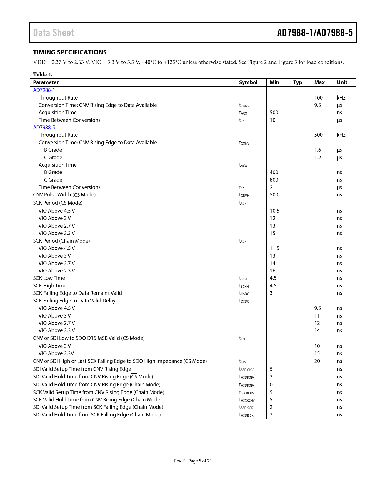 Data Sheet AD7988-1/AD7988-5 TIMING SPECIFICATIONS Table 4 Parameter Symbol Min Typ Max Unit