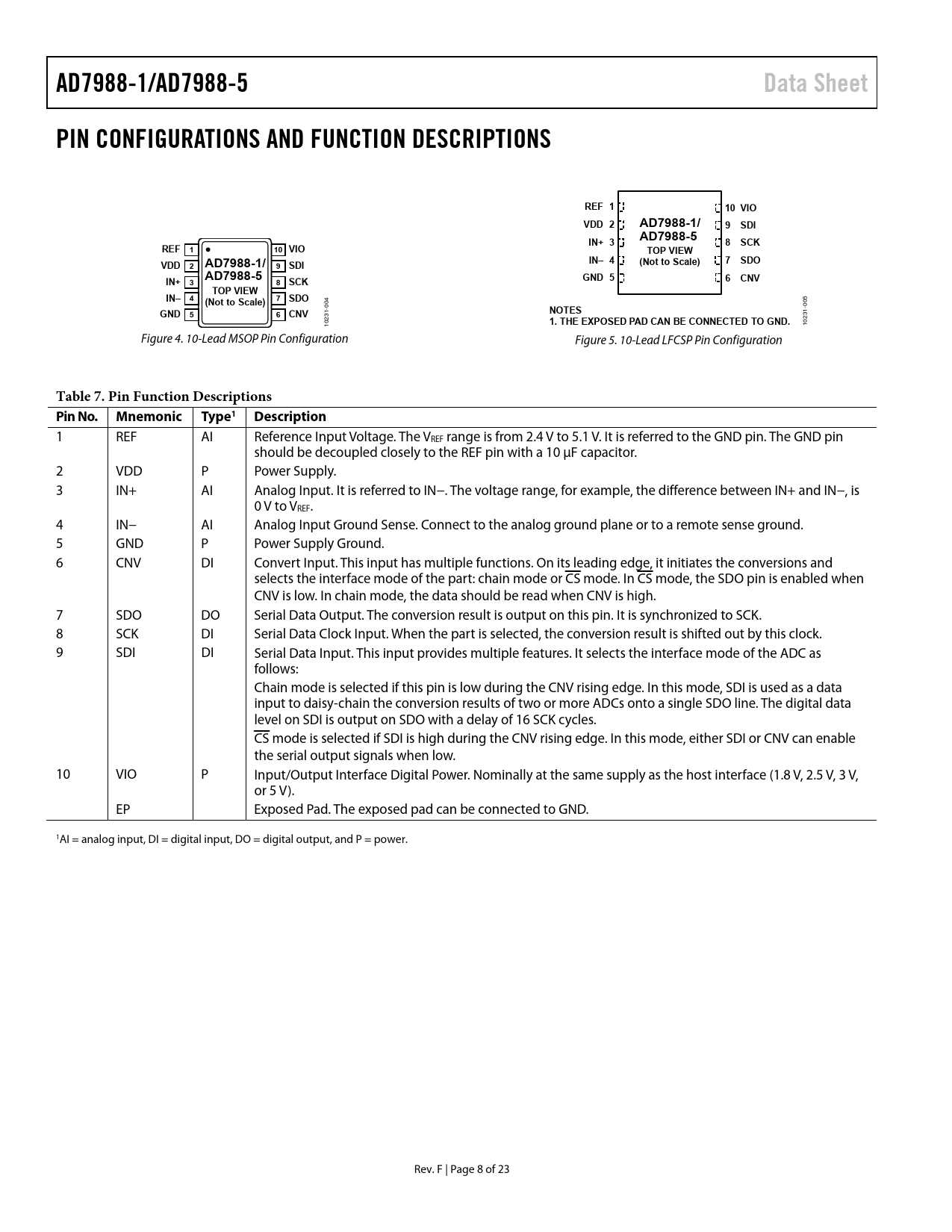 AD7988-1/AD7988-5. Data Sheet. PIN CONFIGURATIONS AND FUNCTION DESCRIPTIONS. REF 1. 10 VIO. VDD 2. AD7988-1/. 9 SDI. AD7988-5. IN+ 3. 8 SCK