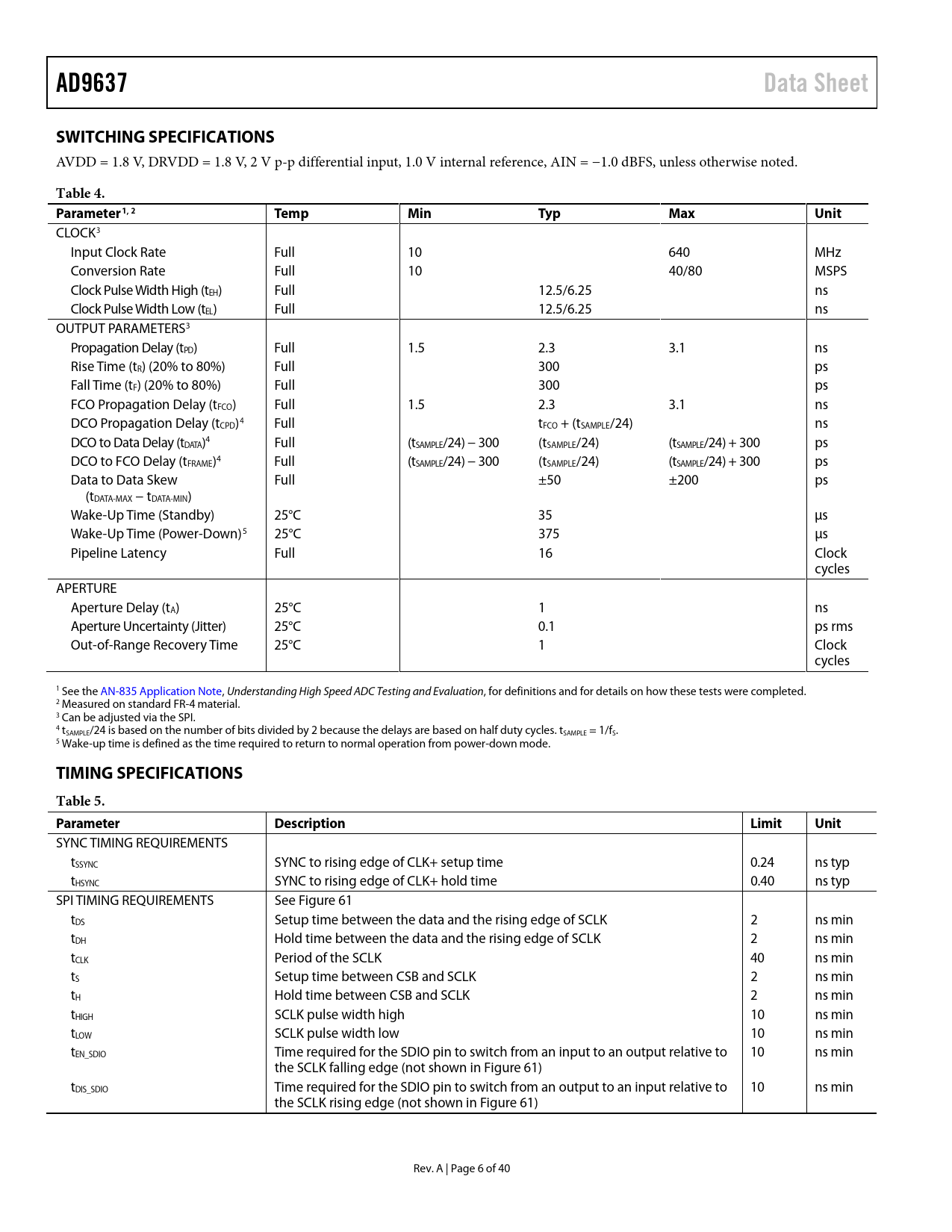 AD9637 Data Sheet SWITCHING SPECIFICATIONS Table 4 Parameter1, 2 Temp Min Typ Max Unit TIMING SPECIFICATIONS Table 5 Parameter