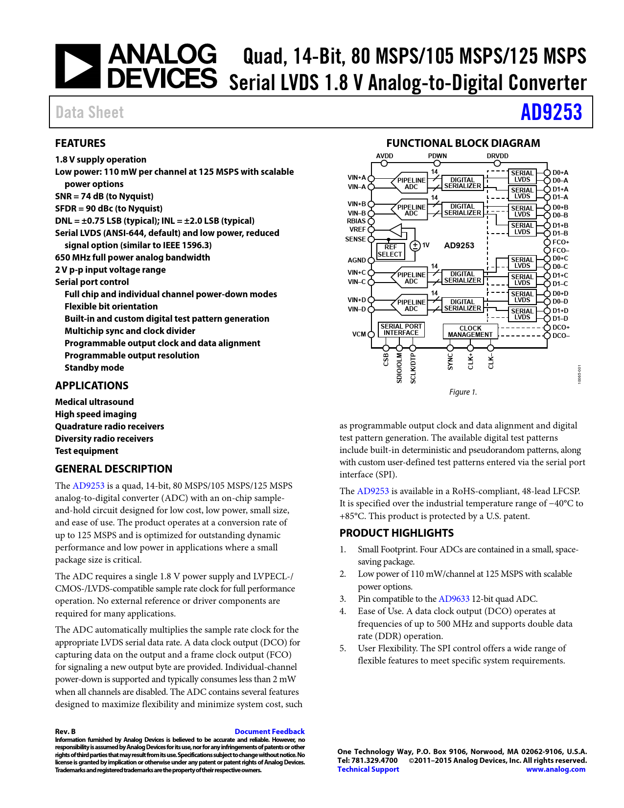 Quad, 14-Bit, 80 MSPS/105 MSPS/125 MSPS. Serial LVDS 1.8 V Analog-to-Digital Converter. Data Sheet. AD9253. FEATURES