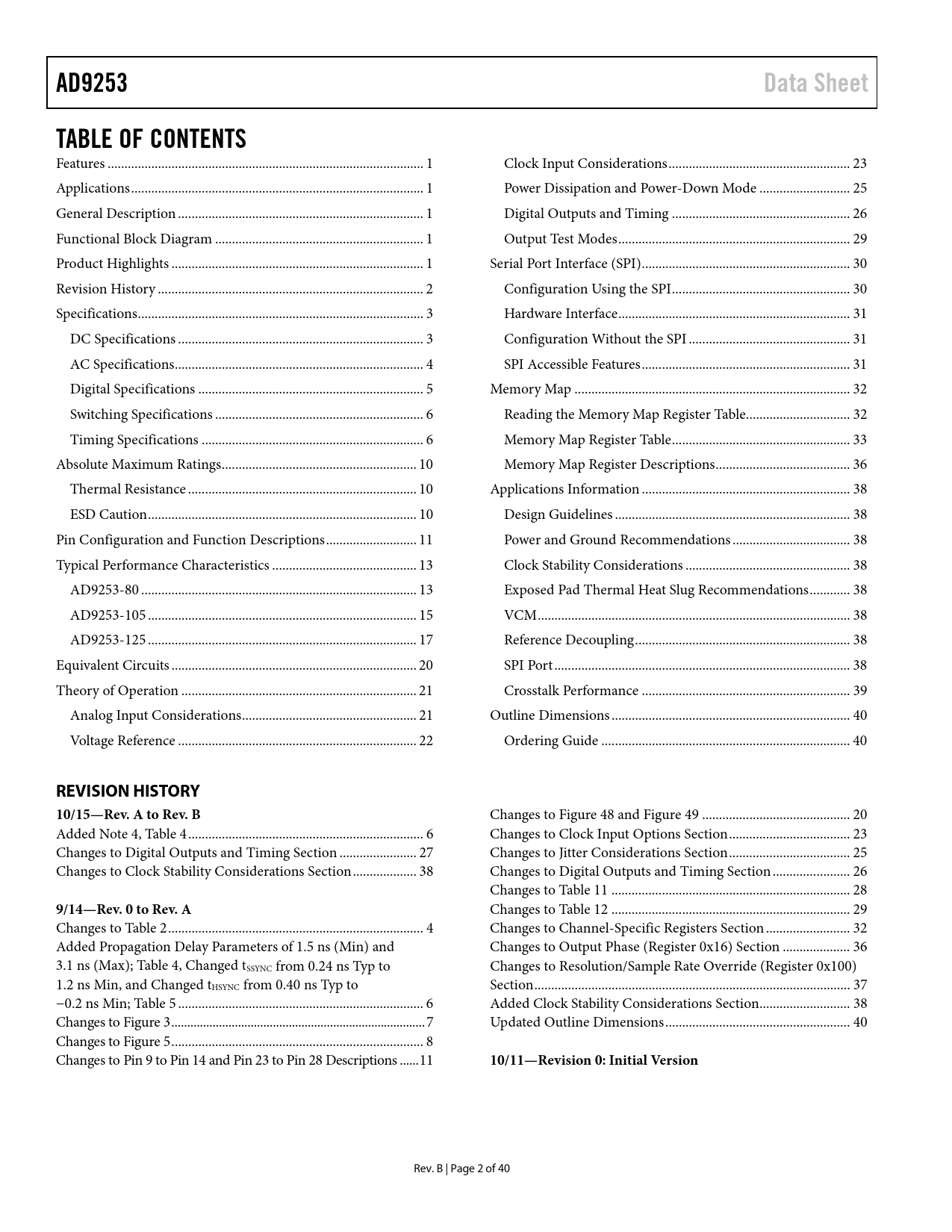 Seiten / Seite41 / 3 — AD9253. Data Sheet. TABLE OF CONTENTS. REVISION HISTORY 10/15—Rev. A to …