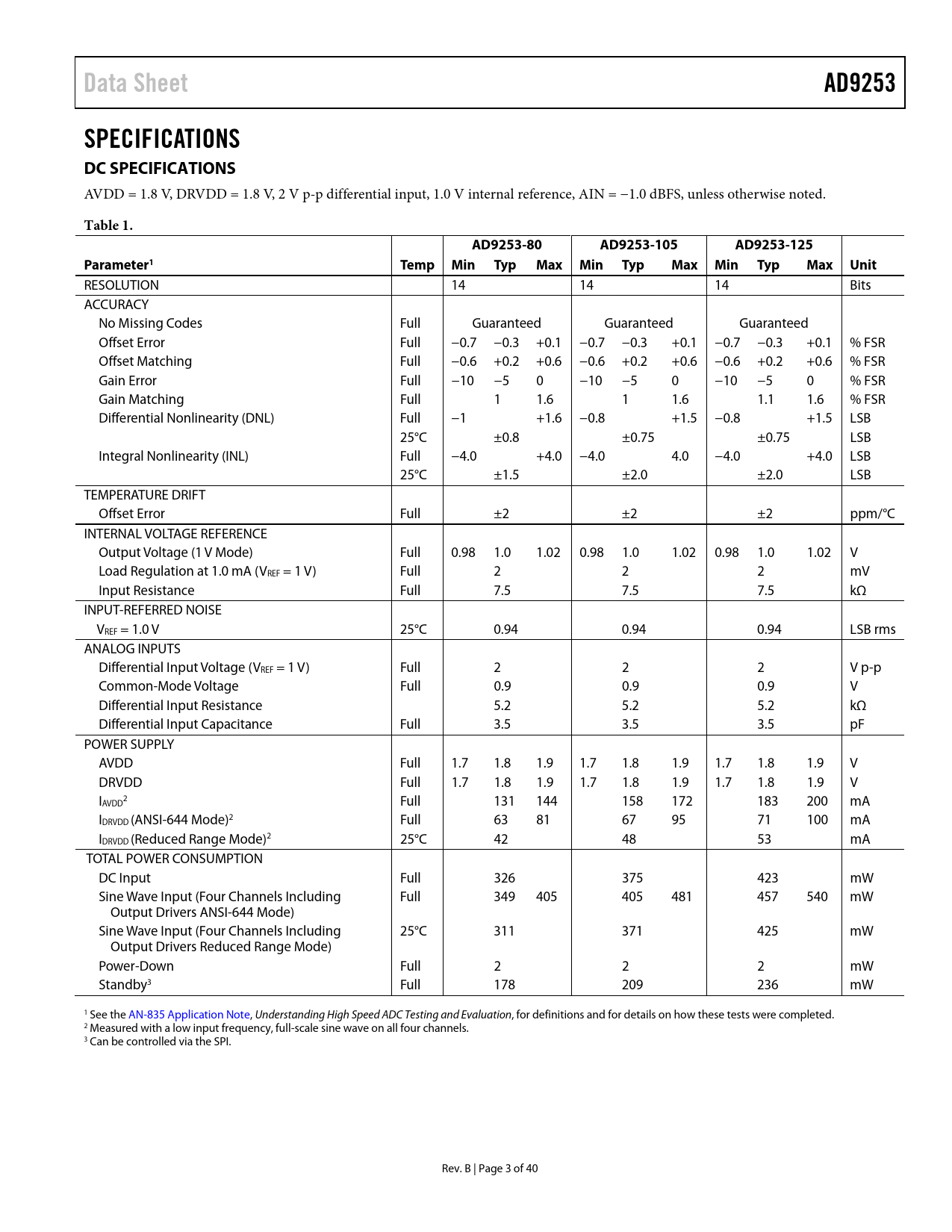 Data SheetAD9253SPECIFICATIONS DC SPECIFICATIONS AVDD = 1.8 V, DRVDD = 1.8 V, 2 V p-p differential input, 1.0 V internal reference, AIN = −1.0 dBFS, unless otherwise noted. Table 1.AD9253-80AD9253-105AD9253-125Parameter1Temp Min TypMax Min TypMax Min TypMax Unit RESOLUTION 14 14 14 Bits ACCURACY No Missing Codes Full Guaranteed Guaranteed Guaranteed Offset Error Full −0.7 −0.3 +0.1 −0.7 −0.3 +0.1 −0.7 −0.3 +0.1 % FSR Offset Matching Full −0.6 +0.2 +0.6 −0.6 +0.2 +0.6 −0.6 +0.2 +0.6 % FSR Gain Error Full −10 −5 0 −10 −5 0 −10 −5 0 % FSR Gain Matching Full 1 1.6 1 1.6 1.1 1.6 % FSR Differential Nonlinearity (DNL) Full −1 +1.6 −0.8 +1.5 −0.8 +1.5 LSB 25°C ±0.8 ±0.75 ±0.75 LSB Integral Nonlinearity (INL) Full −4.0 +4.0 −4.0 4.0 −4.0 +4.0 LSB 25°C ±1.5 ±2.0 ±2.0 LSB TEMPERATURE DRIFT Offset Error Full ±2 ±2 ±2 ppm/°C INTERNAL VOLTAGE REFERENCE Output Voltage (1 V Mode) Full 0.98 1.0 1.02 0.98 1.0 1.02 0.98 1.0 1.02 V Load Regulation at 1.0 mA (VREF = 1 V) Full 2 2 2 mV Input Resistance Full 7.5 7.5 7.5 kΩ INPUT-REFERRED NOISE VREF = 1.0 V 25°C 0. 94 0. 94 0. 94 LSB rms ANALOG INPUTS Differential Input Voltage (VREF = 1 V) Full 2 2 2 V p-p Common-Mode Voltage Full 0.9 0.9 0.9 V Differential Input Resistance 5.2 5.2 5.2 kΩ Differential Input Capacitance Full 3.5 3.5 3.5 pF POWER SUPPLY AVDD Full 1.7 1.8 1.9 1.7 1.8 1.9 1.7 1.8 1.9 V DRVDD Full 1.7 1.8 1.9 1.7 1.8 1.9 1.7 1.8 1.9 V I 2 AVDD Full 131 144 158 172 183 200 mA IDRVDD (ANSI-644 Mode)2 Full 63 81 67 95 71 100 mA IDRVDD (Reduced Range Mode)2 25°C 42 48 53 mA TOTAL POWER CONSUMPTION DC Input Full 326 375 423 mW Sine Wave Input (Four Channels Including Full 349 405 405 481 457 540 mW Output Drivers ANSI-644 Mode) Sine Wave Input (Four Channels Including 25°C 311 371 425 mW Output Drivers Reduced Range Mode) Power-Down Full 2 2 2 mW Standby3 Full 178 209 236 mW 1 See the AN-835 Application Note, Understanding High Speed ADC Testing and Evaluation, for definitions and for details on how these tests were completed. 2 Measured with a low input frequency, full-scale sine wave on all four channels. 3 Can be controlled via the SPI. Rev. B | Page 3 of 40 Document Outline Features Applications General Description Functional Block Diagram Product Highlights Table of Contents Revision History Specifications DC Specifications AC Specifications Digital Specifications Switching Specifications Timing Specifications Timing Diagrams Absolute Maximum Ratings Thermal Resistance ESD Caution Pin Configuration and Function Descriptions Typical Performance Characteristics AD9253-80 AD9253-105 AD9253-125 Equivalent Circuits Theory of Operation Analog Input Considerations Input Common Mode Differential Input Configurations Voltage Reference Internal Reference Connection External Reference Operation Clock Input Considerations Clock Input Options Input Clock Divider Clock Duty Cycle Jitter Considerations Power Dissipation and Power-Down Mode Digital Outputs and Timing SDIO/OLM Pin SCLK/DTP Pin CSB Pin RBIAS Pin Output Test Modes Serial Port Interface (SPI) Configuration Using the SPI Hardware Interface Configuration Without the SPI SPI Accessible Features Memory Map Reading the Memory Map Register Table Open Locations Default Values Logic Levels Channel-Specific Registers Memory Map Register Table Memory Map Register Descriptions Device Index (Register 0x05) Transfer (Register 0xFF) Power Modes (Register 0x08) Bits[7:6]—Open Bit 5—External Power-Down Pin Function Bits[4:2]—Open Bits[1:0]—Power Mode Enhancement Control (Register 0x0C) Bits[7:3]—Open Bit 2—Chop Mode Bits[1:0]—Open Output Mode (Register 0x14) Bit 7—Open Bit 6—LVDS-ANSI/LVDS-IEEE Option Bits[5:3]—Open Bit 2—Output Invert Bit 1—Open Bit 0—Output Format Output Adjust (Register 0x15) Bits[7:6]—Open Bits[5:4]—Output Driver Termination Bits[3:1]—Open Bit 0—Output Drive Output Phase (Register 0x16) Bit 7—Open Bits[6:4]—Input Clock Phase Adjust Bits[3:0]—Output Clock Phase Adjust Serial Output Data Control (Register 0x21) Resolution/Sample Rate Override (Register 0x100) User I/O Control 2 (Register 0x101) Bits[7:1]—Open Bit 0—SDIO Pull-Down User I/O Control 3 (Register 0x102) Bits[7:4]—Open Bit 3—VCM Power-Down Bits[2:0]—Open Applications Information Design Guidelines Power and Ground Recommendations Clock Stability Considerations Exposed Pad Thermal Heat Slug Recommendations VCM Reference Decoupling SPI Port Crosstalk Performance Outline Dimensions Ordering Guide