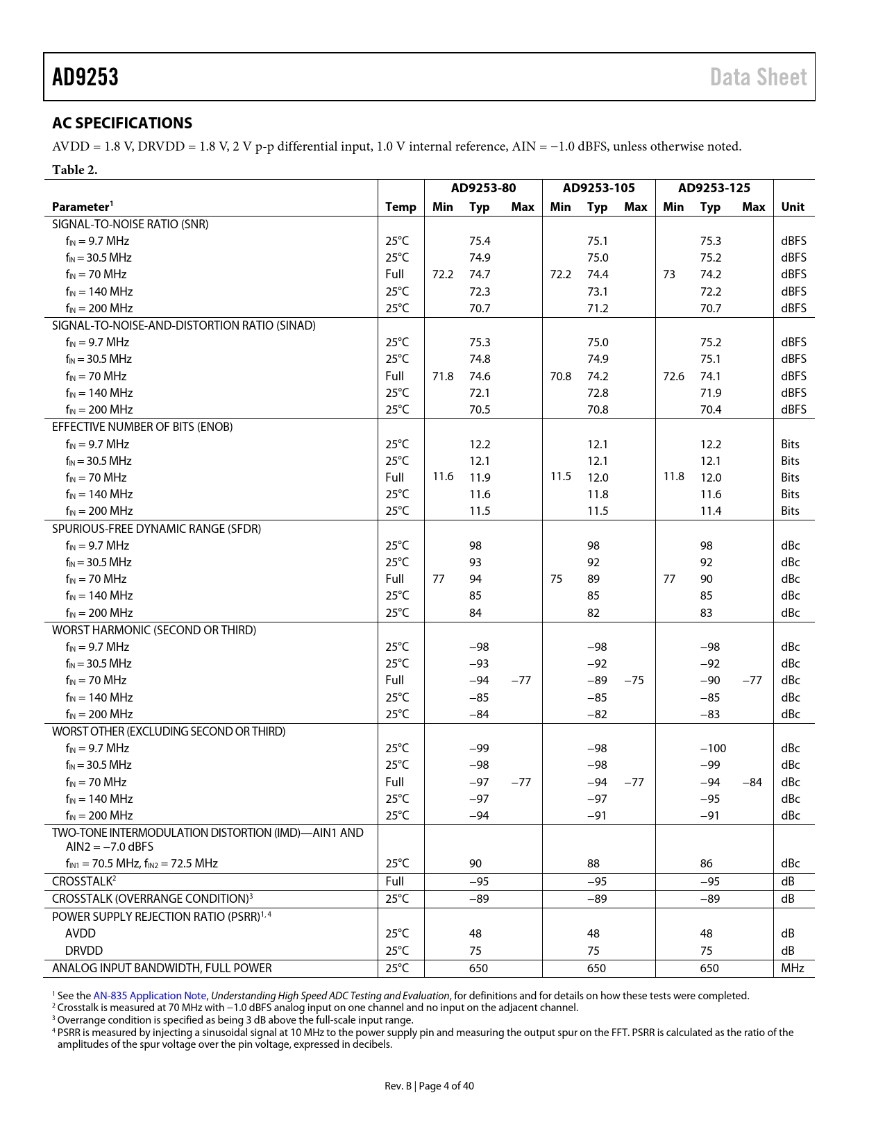 AD9253. Data Sheet. AC SPECIFICATIONS. Table 2. AD9253-80. AD9253-105. AD9253-125. Parameter1. Temp Min Typ. Max Min Typ Max Min Typ