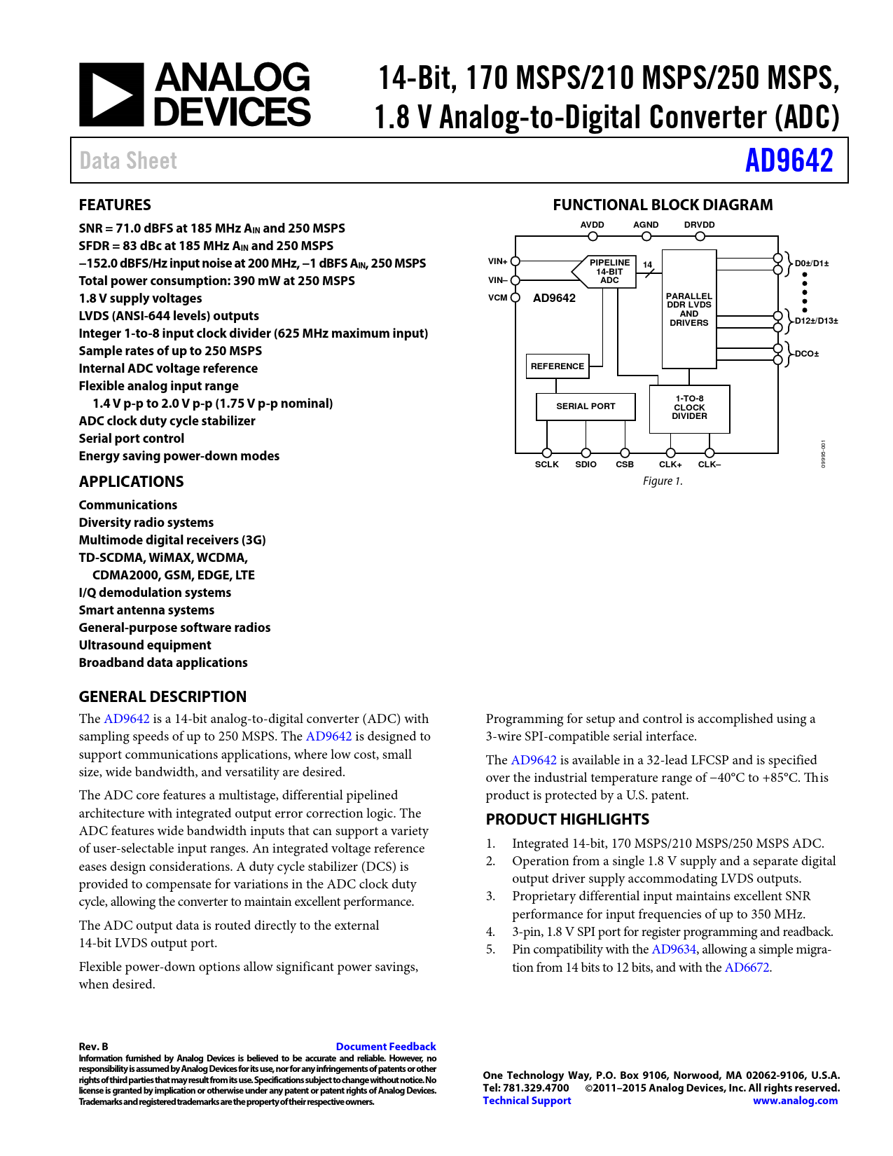 14-Bit, 170 MSPS/210 MSPS/250 MSPS,. 1.8 V Analog-to-Digital Converter (ADC). Data Sheet. AD9642. FEATURES