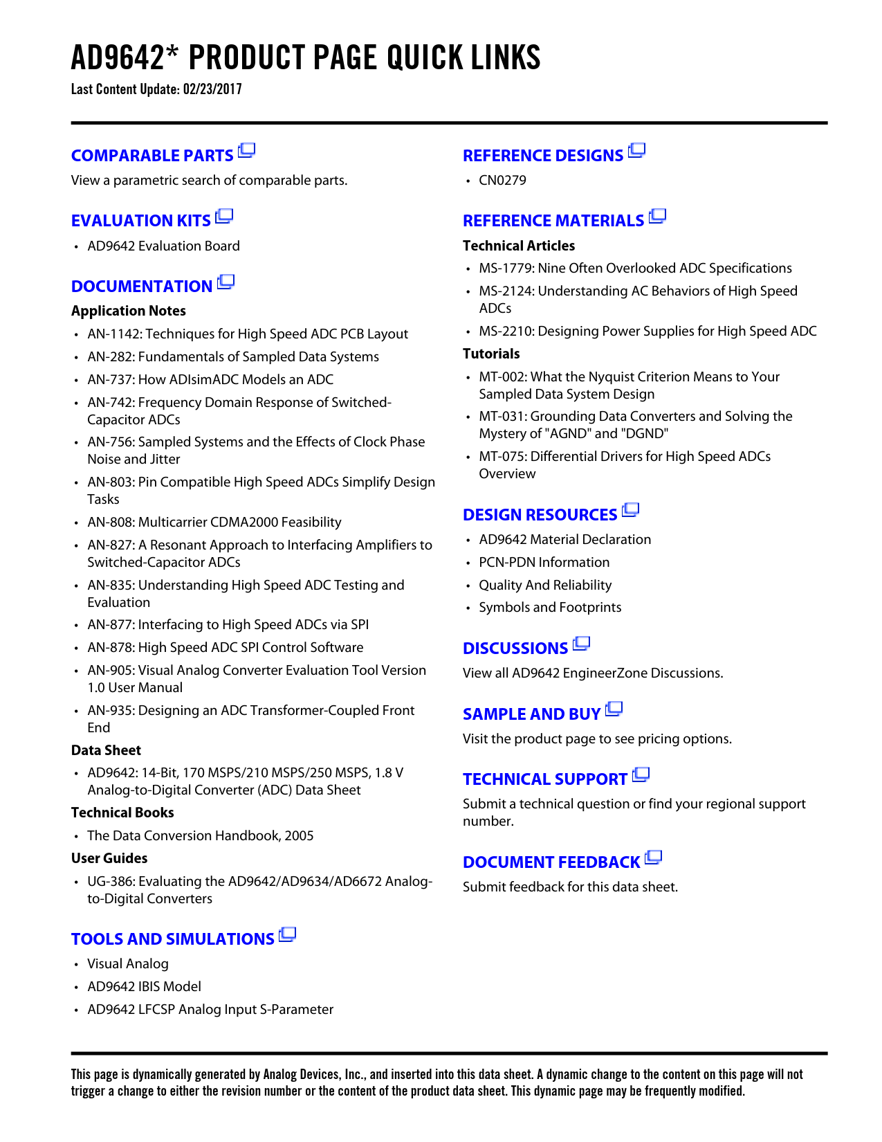 AD9642* PRODUCT PAGE QUICK LINKS Last Content Update: 02/23/2017. COMPARABLE PARTS. REFERENCE DESIGNS. EVALUATION KITS