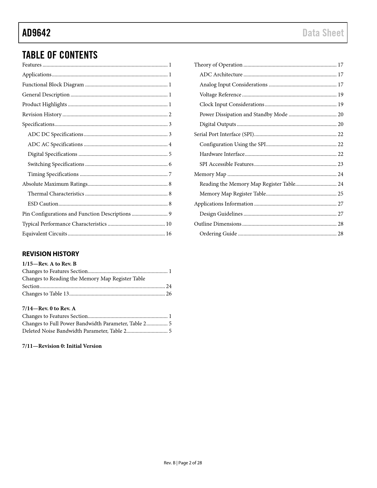 AD9642 Data Sheet TABLE OF CONTENTS REVISION HISTORY 1/15—Rev A to Rev B 7/14—Rev 0 to Rev A
