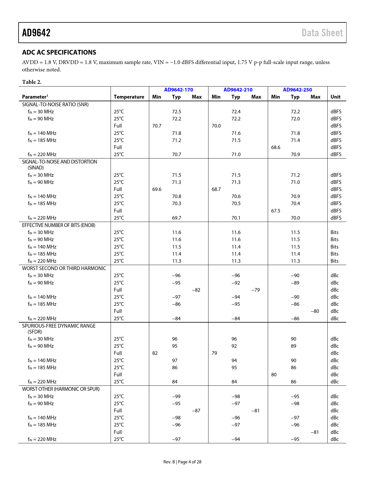AD9642. Data Sheet. ADC AC SPECIFICATIONS. Table 2. AD9642-170. AD9642-210. AD9642-250. Parameter1. Temperature. Min. Typ. Max. Unit