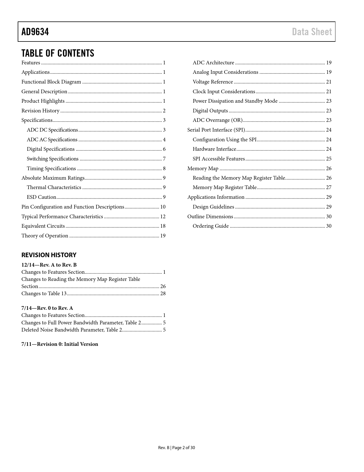 AD9634 Data Sheet TABLE OF CONTENTS REVISION HISTORY 12/14—Rev A to Rev B 7/14—Rev 0 to Rev A
