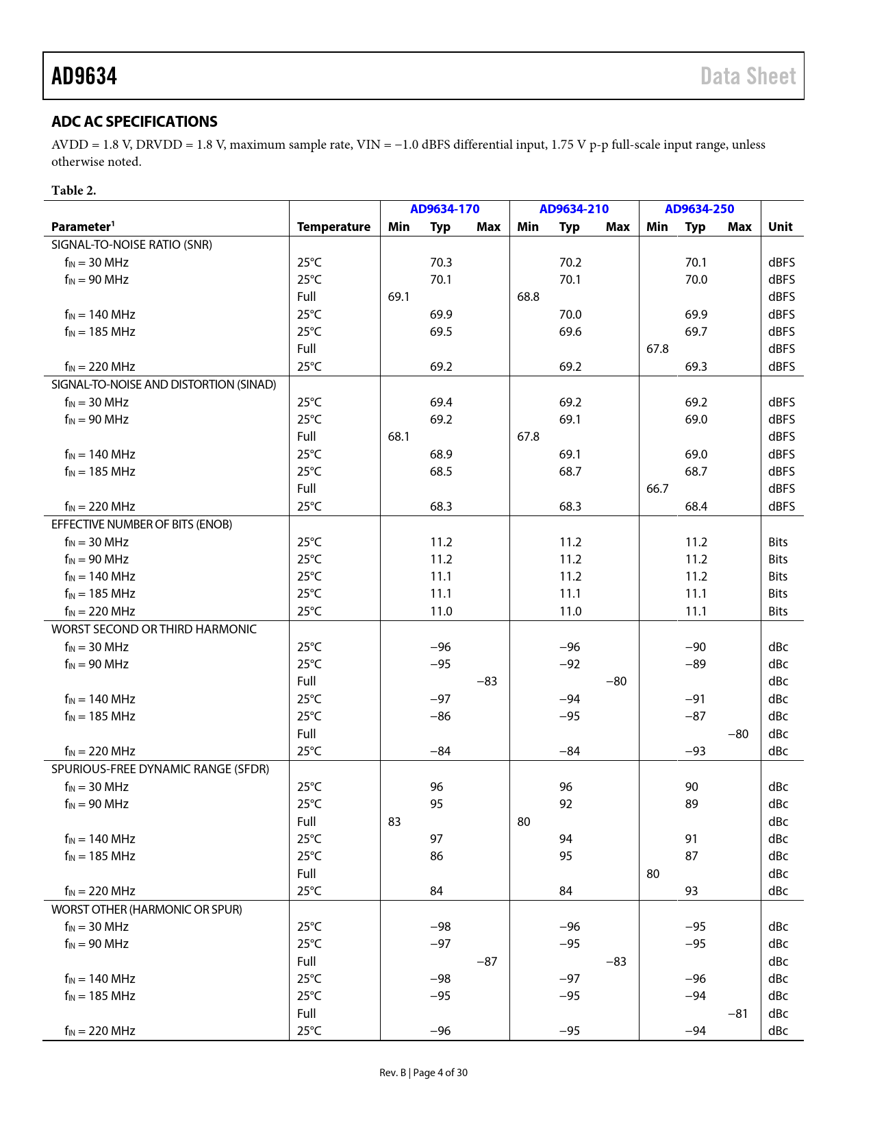 AD9634. Data Sheet. ADC AC SPECIFICATIONS. Table 2. AD9634-170. AD9634-210. AD9634-250. Parameter1. Temperature. Min. Typ. Max Min. Max Min Typ
