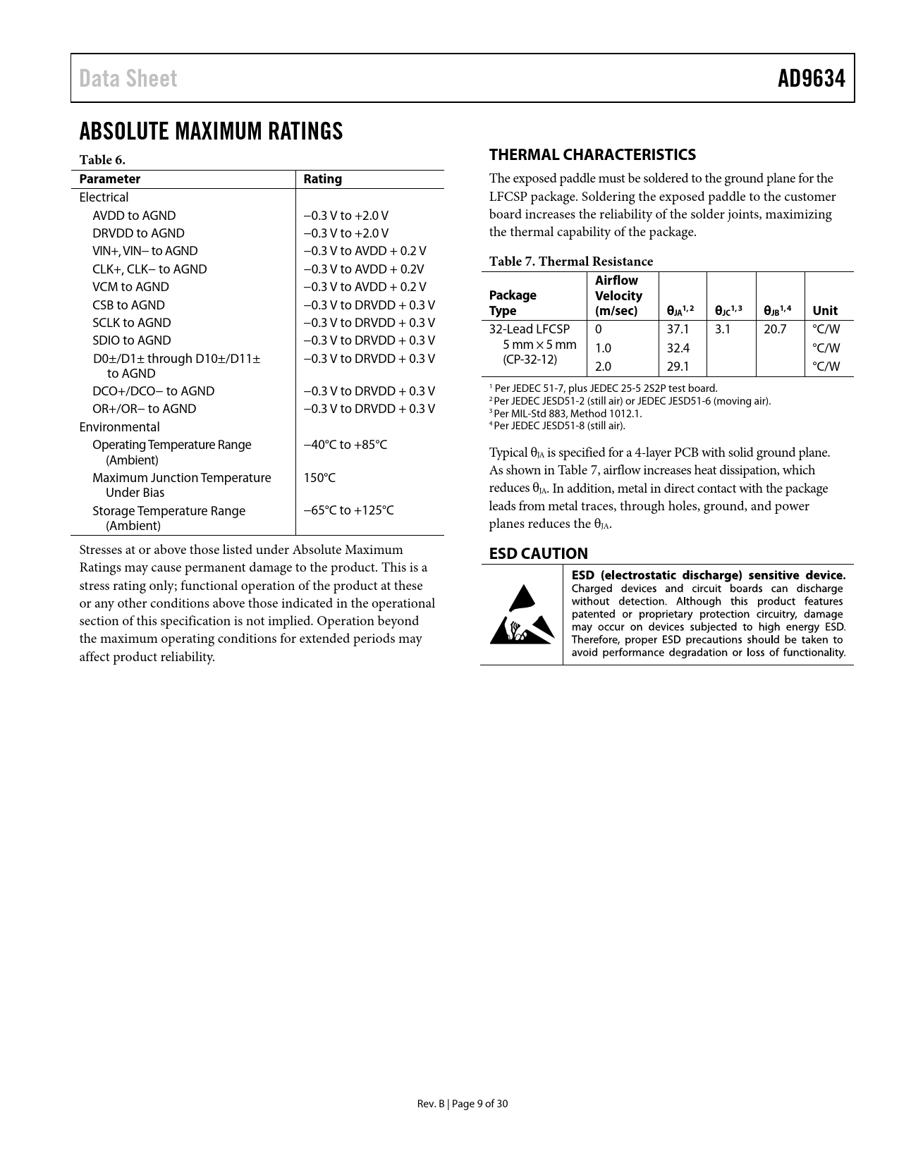 link to page 10 Data SheetAD9634ABSOLUTE MAXIMUM RATINGS Table 6.THERMAL CHARACTERISTICSParameter Rating The exposed paddle must be soldered to the ground plane for the Electrical LFCSP package. Soldering the exposed paddle to the customer AVDD to AGND −0.3 V to +2.0 V board increases the reliability of the solder joints, maximizing DRVDD to AGND −0.3 V to +2.0 V the thermal capability of the package. VIN+, VIN− to AGND −0.3 V to AVDD + 0.2 V Table 7. Thermal Resistance CLK+, CLK− to AGND −0.3 V to AVDD + 0.2V Airflow VCM to AGND −0.3 V to AVDD + 0.2 V PackageVelocity CSB to AGND −0.3 V to DRVDD + 0.3 V Type(m/sec) θ 1, 21, 31, 4JAθJCθJBUnit SCLK to AGND −0.3 V to DRVDD + 0.3 V 32-Lead LFCSP 0 37.1 3.1 20.7 °C/W SDIO to AGND −0.3 V to DRVDD + 0.3 V 5 mm × 5 mm 1.0 32.4 °C/W D0±/D1± through D10±/D11± −0.3 V to DRVDD + 0.3 V (CP-32-12) 2.0 29.1 °C/W to AGND DCO+/DCO− to AGND −0.3 V to DRVDD + 0.3 V 1 Per JEDEC 51-7, plus JEDEC 25-5 2S2P test board. 2 Per JEDEC JESD51-2 (still air) or JEDEC JESD51-6 (moving air). OR+/OR− to AGND −0.3 V to DRVDD + 0.3 V 3 Per MIL-Std 883, Method 1012.1. Environmental 4 Per JEDEC JESD51-8 (still air). Operating Temperature Range −40°C to +85°C Typical θ (Ambient) JA is specified for a 4-layer PCB with solid ground plane. As shown in Table 7, airflow increases heat dissipation, which Maximum Junction Temperature 150°C Under Bias reduces θJA. In addition, metal in direct contact with the package Storage Temperature Range −65°C to +125°C leads from metal traces, through holes, ground, and power (Ambient) planes reduces the θJA. Stresses at or above those listed under Absolute Maximum ESD CAUTION Ratings may cause permanent damage to the product. This is a stress rating only; functional operation of the product at these or any other conditions above those indicated in the operational section of this specification is not implied. Operation beyond the maximum operating conditions for extended periods may affect product reliability. Rev. B | Page 9 of 30 Document Outline FEATURES APPLICATIONS FUNCTIONAL BLOCK DIAGRAM GENERAL DESCRIPTION PRODUCT HIGHLIGHTS TABLE OF CONTENTS REVISION HISTORY SPECIFICATIONS ADC DC SPECIFICATIONS ADC AC SPECIFICATIONS DIGITAL SPECIFICATIONS SWITCHING SPECIFICATIONS Timing Diagram TIMING SPECIFICATIONS ABSOLUTE MAXIMUM RATINGS THERMAL CHARACTERISTICS ESD CAUTION PIN CONFIGURATION AND FUNCTION DESCRIPTIONS TYPICAL PERFORMANCE CHARACTERISTICS EQUIVALENT CIRCUITS THEORY OF OPERATION ADC ARCHITECTURE ANALOG INPUT CONSIDERATIONS Input Common Mode Differential Input Configurations VOLTAGE REFERENCE CLOCK INPUT CONSIDERATIONS Clock Input Options Input Clock Divider Clock Duty Cycle Jitter Considerations POWER DISSIPATION AND STANDBY MODE DIGITAL OUTPUTS Digital Output Enable Function (OEB) Timing Data Clock Output (DCO) ADC OVERRANGE (OR) SERIAL PORT INTERFACE (SPI) CONFIGURATION USING THE SPI HARDWARE INTERFACE SPI ACCESSIBLE FEATURES MEMORY MAP READING THE MEMORY MAP REGISTER TABLE Open Locations Default Values Logic Levels Transfer Register Map MEMORY MAP REGISTER TABLE APPLICATIONS INFORMATION DESIGN GUIDELINES Power and Ground Recommendations Exposed Paddle Thermal Heat Slug Recommendations VCM SPI Port OUTLINE DIMENSIONS ORDERING GUIDE