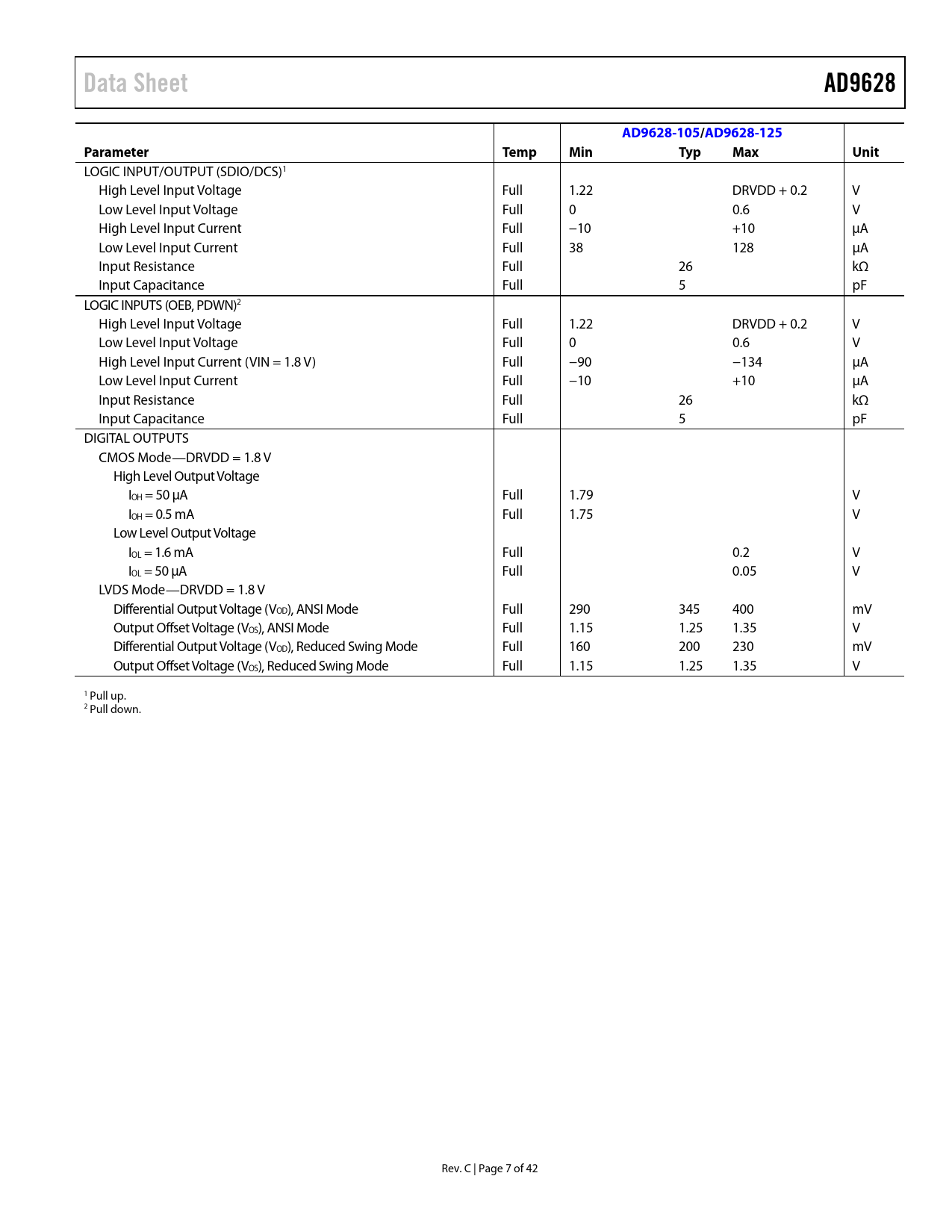 Data Sheet. AD9628. AD9628-105/AD9628-125. Parameter. Temp. Min. Typ. Max. Unit