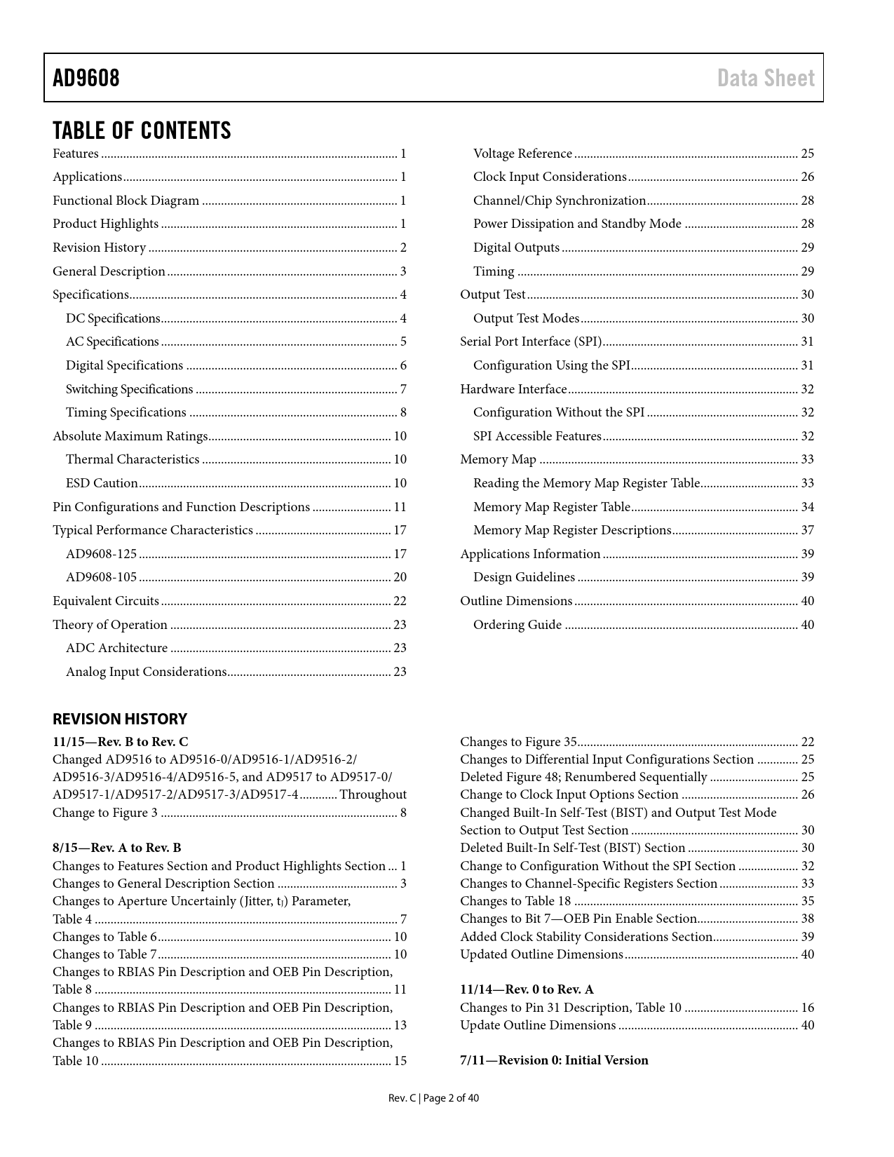 Seiten / Seite41 / 3 — AD9608. Data Sheet. TABLE OF CONTENTS. REVISION HISTORY 11/15—Rev. B to …