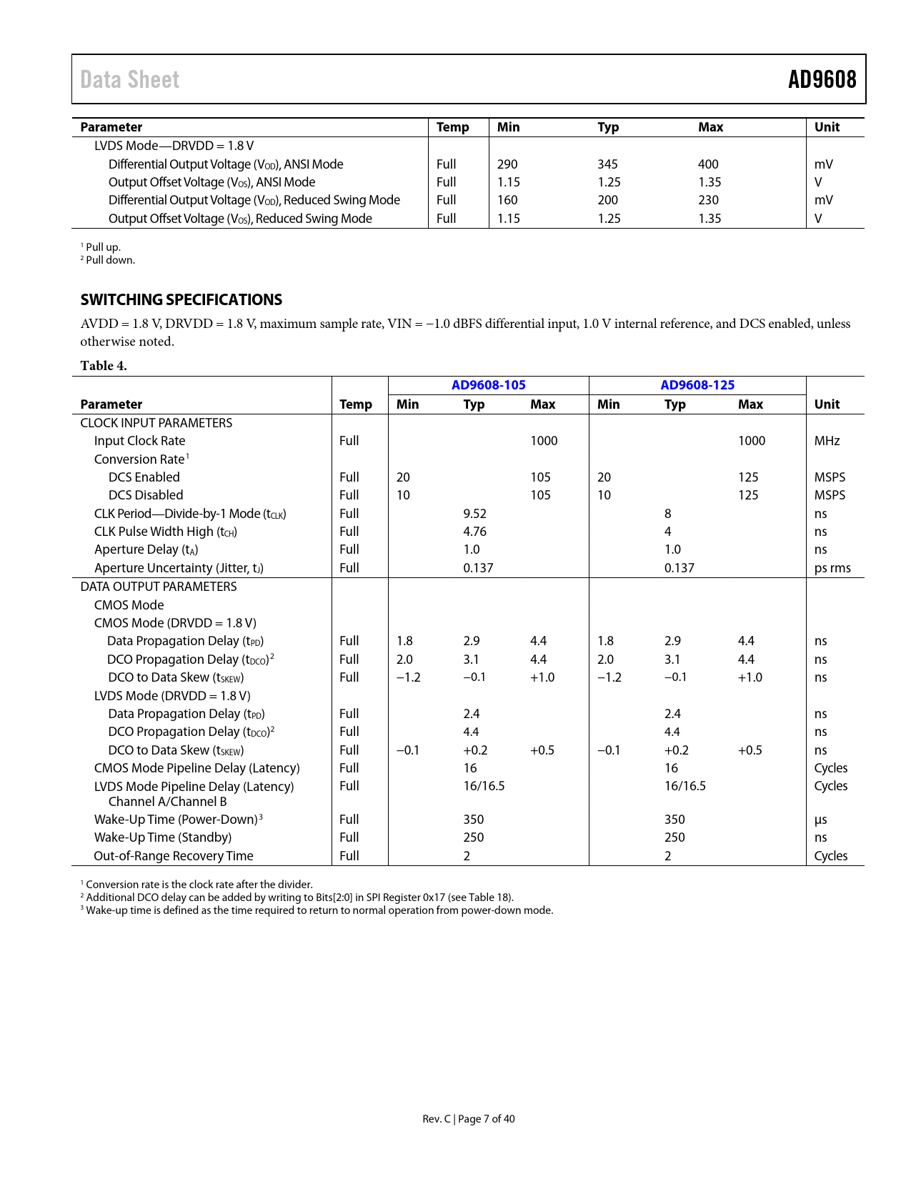 Data Sheet AD9608 Parameter Temp Min Typ Max Unit SWITCHING SPECIFICATIONS Table 4 AD9608-105 AD9608-125