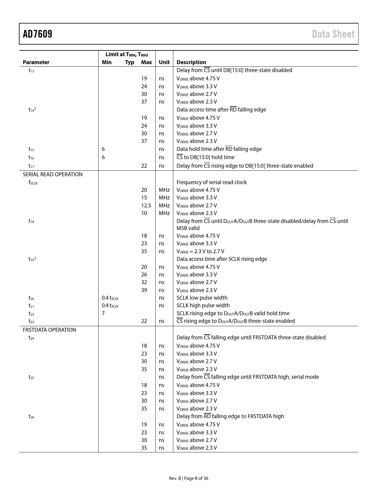 link to page 10 link to page 10 AD7609Data SheetLimit at TMIN, TMAXParameterMinTypMaxUnitDescription t13 Delay from CS until DB[15:0] three-state disabled 19 ns VDRIVE above 4.75 V 24 ns VDRIVE above 3.3 V 30 ns VDRIVE above 2.7 V 37 ns VDRIVE above 2.3 V t 3 14 Data access time after RD falling edge 19 ns VDRIVE above 4.75 V 24 ns VDRIVE above 3.3 V 30 ns VDRIVE above 2.7 V 37 ns VDRIVE above 2.3 V t15 6 ns Data hold time after RD falling edge t16 6 ns CS to DB[15:0] hold time t17 22 ns Delay from CS rising edge to DB[15:0] three-state enabled SERIAL READ OPERATION fSCLK Frequency of serial read clock 20 MHz VDRIVE above 4.75 V 15 MHz VDRIVE above 3.3 V 12.5 MHz VDRIVE above 2.7 V 10 MHz VDRIVE above 2.3 V t18 Delay from CS until DOUTA/DOUTB three-state disabled/delay from CS until MSB valid 18 ns VDRIVE above 4.75 V 23 ns VDRIVE above 3.3 V 35 ns VDRIVE = 2.3 V to 2.7 V t 3 19 Data access time after SCLK rising edge 20 ns VDRIVE above 4.75 V 26 ns VDRIVE above 3.3 V 32 ns VDRIVE above 2.7 V 39 ns VDRIVE above 2.3 V t20 0.4 tSCLK ns SCLK low pulse width t21 0.4 tSCLK ns SCLK high pulse width t22 7 SCLK rising edge to DOUTA/DOUTB valid hold time t23 22 ns CS rising edge to DOUTA/DOUTB three-state enabled FRSTDATA OPERATION t24 Delay from CS falling edge until FRSTDATA three-state disabled 18 ns VDRIVE above 4.75 V 23 ns VDRIVE above 3.3 V 30 ns VDRIVE above 2.7 V 35 ns VDRIVE above 2.3 V t25 ns Delay from CS falling edge until FRSTDATA high, serial mode 18 ns VDRIVE above 4.75 V 23 ns VDRIVE above 3.3 V 30 ns VDRIVE above 2.7 V 35 ns VDRIVE above 2.3 V t26 Delay from RD falling edge to FRSTDATA high 19 ns VDRIVE above 4.75 V 23 ns VDRIVE above 3.3 V 30 ns VDRIVE above 2.7 V 35 ns VDRIVE above 2.3 V Rev. B | Page 8 of 36 Document Outline Features Applications Companion Products Functional Block Diagram Table of Contents Revision History General Description Specifications Timing Specifications Timing Diagrams Absolute Maximum Ratings Thermal Resistance ESD Caution Pin Configuration and Function Descriptions Typical Performance Characteristics Terminology Theory of Operation Converter Details Analog Input Analog Input Ranges Analog Input Impedance Analog Input Clamp Protection Analog Input Antialiasing Filter Track-and-Hold Amplifiers ADC Transfer Function Internal/External Reference External Reference Mode Internal Reference Mode Typical Connection Diagram Power-Down Modes Conversion Control Simultaneous Sampling on All Analog Input Channels Simultaneously Sampling Two Sets of Channels Digital Interface Parallel Interface (/PAR/SER SEL = 0) Serial Interface (/PAR/SER SEL = 1) Reading During Conversion Digital Filter Layout Guidelines Outline Dimensions Ordering Guide