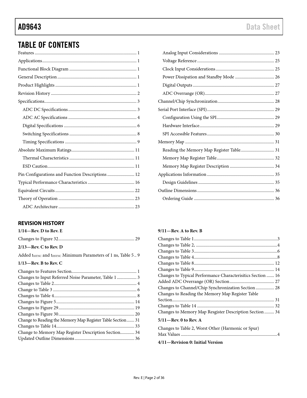 AD9643 Data Sheet TABLE OF CONTENTS REVISION HISTORY 1/14—Rev D to Rev E 9/11—Rev A to Rev B 2/13—Rev C to Rev D