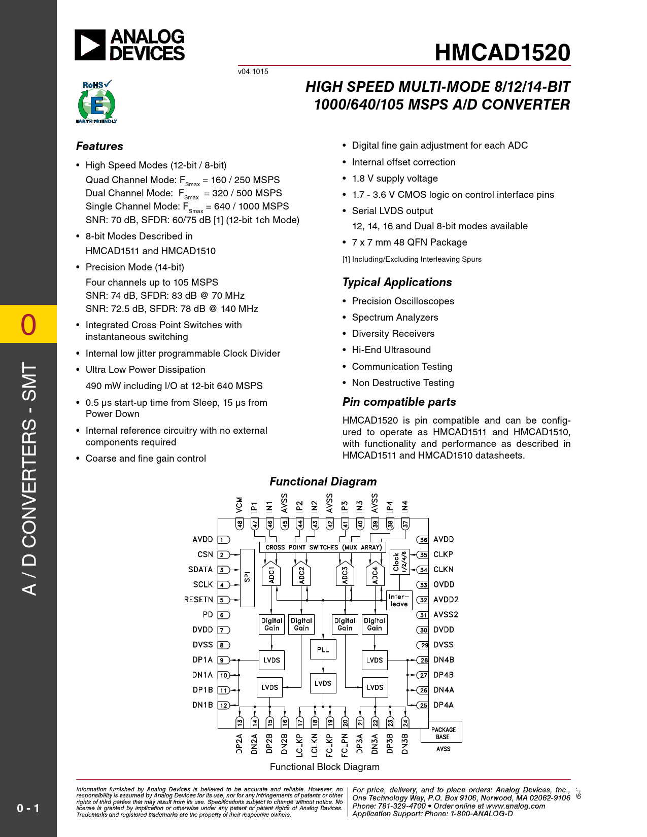 HMCAD1520 v04.1015 HigH Speed Multi-Mode 8/12/14-Bit1000/640/105 MSpS A/d ConverterFeatures • Digital fine gain adjustment for each ADC • High speed Modes (12-bit / 8-bit) • Internal offset correction Quad Channel Mode: F = 160 / 250 MsPs • 1.8 v supply voltage smax Dual Channel Mode: F = 320 / 500 MsPs smax • 1.7 - 3.6 v CMos logic on control interface pins single Channel Mode: F = 640 / 1000 MsPs smax • serial LvDs output snr: 70 dB, sFDr: 60/75 dB [1] (12-bit 1ch Mode) 12, 14, 16 and Dual 8-bit modes available • 8-bit Modes Described in • 7 x 7 mm 48 QFn Package HMCAD1511 and HMCAD1510 [1] Including/excluding Interleaving spurs • Precision Mode (14-bit) Four channels up to 105 MsPs typical Applications snr: 74 dB, sFDr: 83 dB @ 70 MHz • Precision oscil oscopes 0 snr: 72.5 dB, sFDr: 78 dB @ 140 MHz • spectrum Analyzers • Integrated Cross Point switches with instantaneous switching • Diversity receivers • Internal low jitter programmable Clock Divider • Hi-end Ultrasound t • Ultra Low Power Dissipation • Communication testing M • non Destructive testing s 490 mW including I/o at 12-bit 640 MsPs • 0.5 µs start-up time from sleep, 15 µs from pin compatible parts s - Power Down HMCAD1520 is pin compatible and can be config- r • Internal reference circuitry with no external ured to operate as HMCAD1511 and HMCAD1510, e components required with functionality and performance as described in t • Coarse and fine gain control HMCAD1511 and HMCAD1510 datasheets. r e Functional diagram v n o /D C A Functional Block Diagram InfoIn r fo martm ioat n io f n ur f n u isrn h i esh d e bd y b Ay n A al n o a g log De D vi e c v e ic s e i s s i b s elib e e v li e ev d e t d o t bo e b a e cca uc r c a u t r e at a e n a d nd reli r a el blia e b . le H . o Ho we w ve e r v , e nr, o no Fo F r o pr p ric r eic , e d, d eli e v l e irve y, ry a , a n n d td t o o p placla e ce o ord r e d rse : rs A: A naln oal g og D Devi e c v eic s e , s I , I nc.n , c., res r pe osp nso i n bi s li itbi y liity i s a s a ssu ss m u e m d e b d b y A y A nal n o a g lo D g D evi e c v e ic s f e o s f r itor i s u ts u se, se no, n r f o o r f r aonr a y i ny i fri n n fr g ing em em ent e s n o ts o f paf p t a entte s n o ts o r ot r o he th r er OnOn e Te T ec e h c n h olnool g ogy W y Way ay , P , P .O .O . B . B o o x 9x 9 10 1 6 06 , N , N or o w r ow o o d od, M , M A 0 A 020 2 6 0 2 6 - 2 9 - 1 9 0 1 6 06 rights of third parties that may result from its use. Specifications subject to change without notice. No 0 - 1 rights of third parties that may result from its use. Specifications subject to change without notice. No Ph P o h n o e ne : 7 : 7 81 81 -3 - 2 3 9 2 - 9 4 - 7 4 0 700 • O 0 • Ord r e de r o r o nli n n lin e ae a t t w ww w w. w an.a alna oglo . g co.co m m license is granted by implication or otherwise under any patent or patent rights of Analog Devices. license is granted by implication or otherwise under any patent or patent rights of Analog Devices. Trademarks and registered trademarks are the property of their respective owners. Application Support: Phone: 1-800-ANALOG-D Trademarks and registered trademarks are the property of their respective owners. Application Support: Phone: 1-800-ANALOG-D