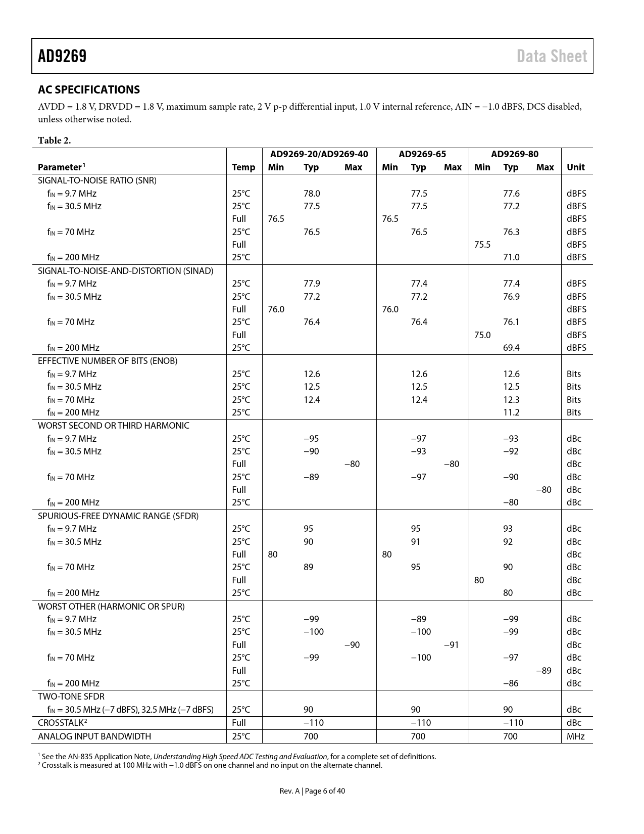 AD9269. Data Sheet. AC SPECIFICATIONS. Table 2. AD9269-20/AD9269-40. AD9269-65. AD9269-80. Parameter1. Temp Min. Typ. Max. Min Typ. Max Min Typ