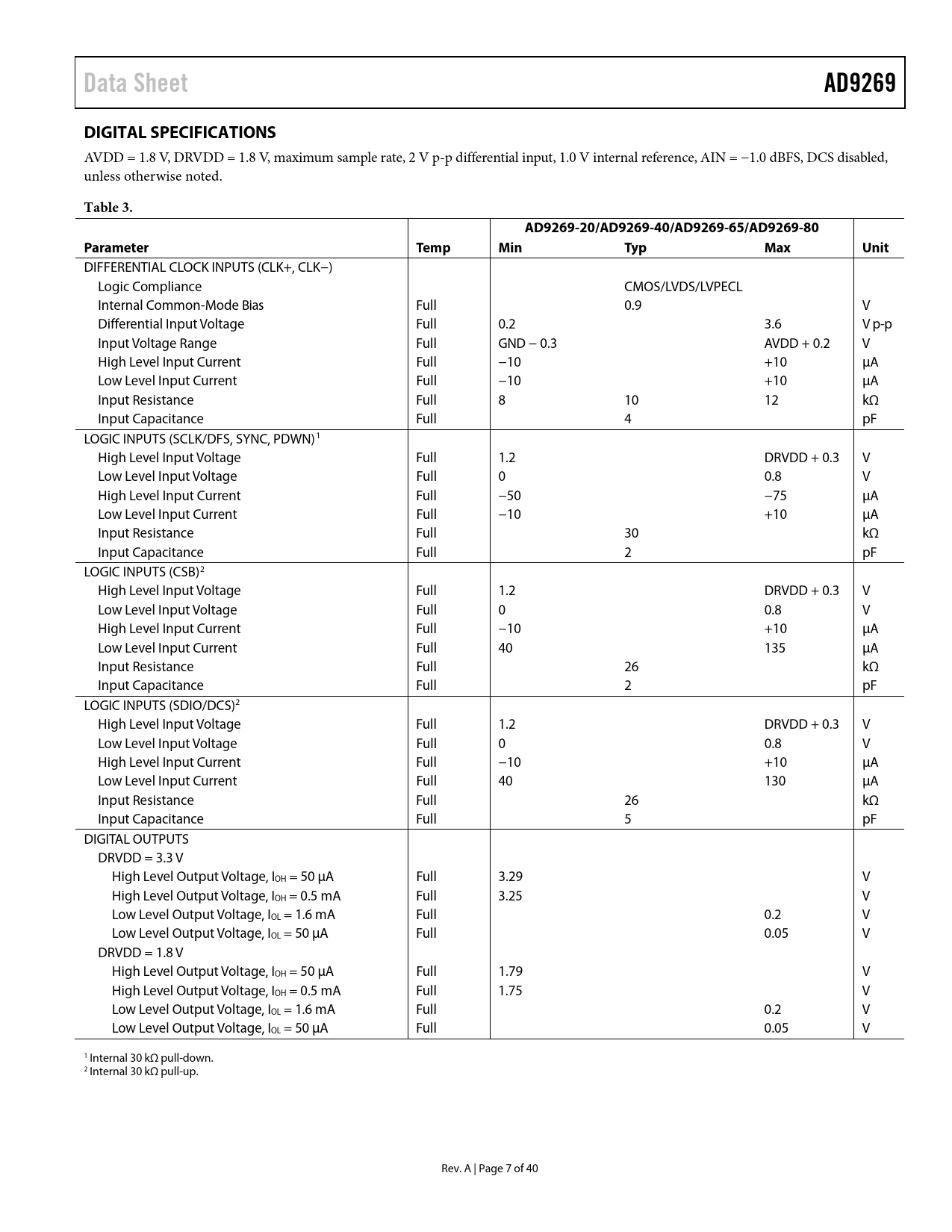 Data Sheet. AD9269. DIGITAL SPECIFICATIONS. Table 3. AD9269-20/AD9269-40/AD9269-65/AD9269-80. Parameter. Temp. Min. Typ. Max. Unit