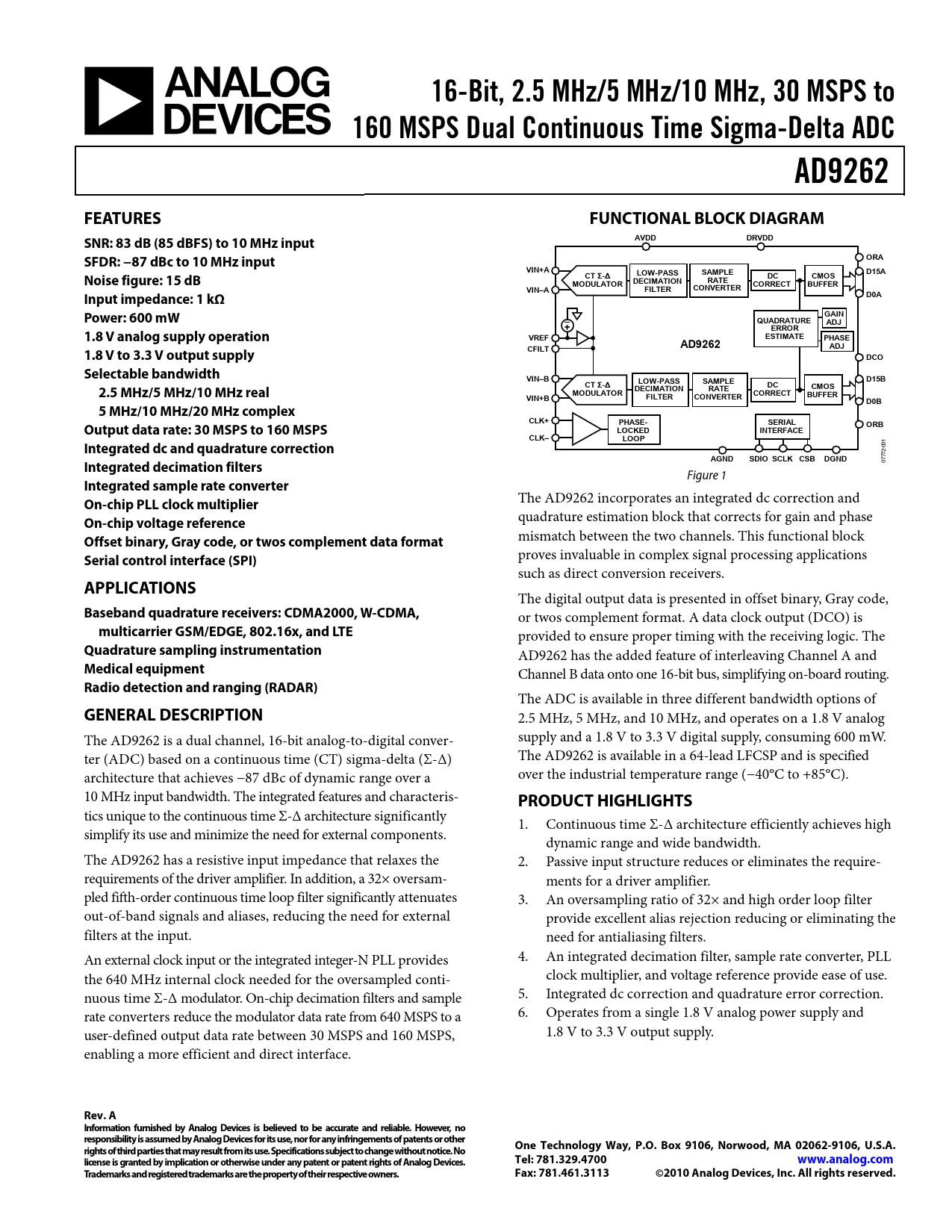 16-Bit, 2.5 MHz/5 MHz/10 MHz, 30 MSPS to. 160 MSPS Dual Continuous Time Sigma-Delta ADC. AD9262. FEATURES