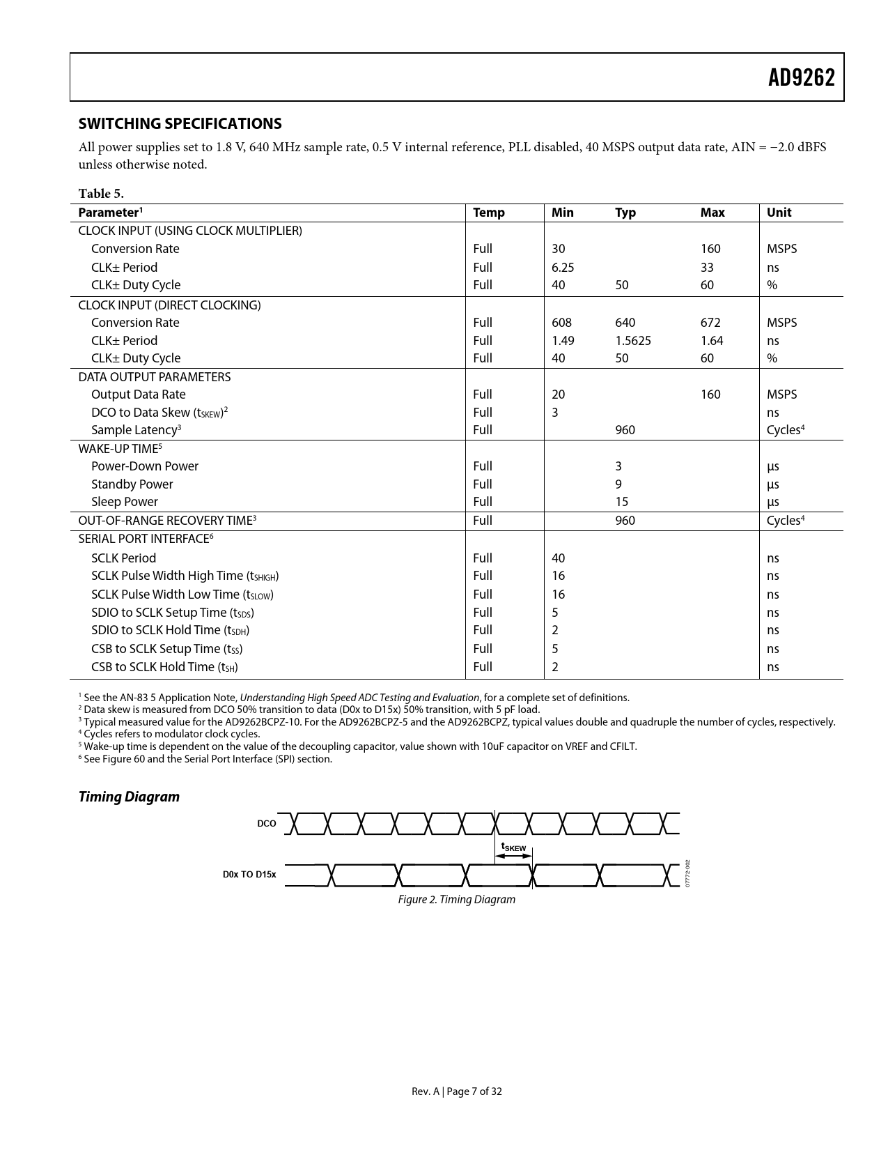 AD9262 SWITCHING SPECIFICATIONS Table 5 Parameter1 T emp Min Typ Max Unit Timing Diagram DCO tSKEW D0x TO D15x
