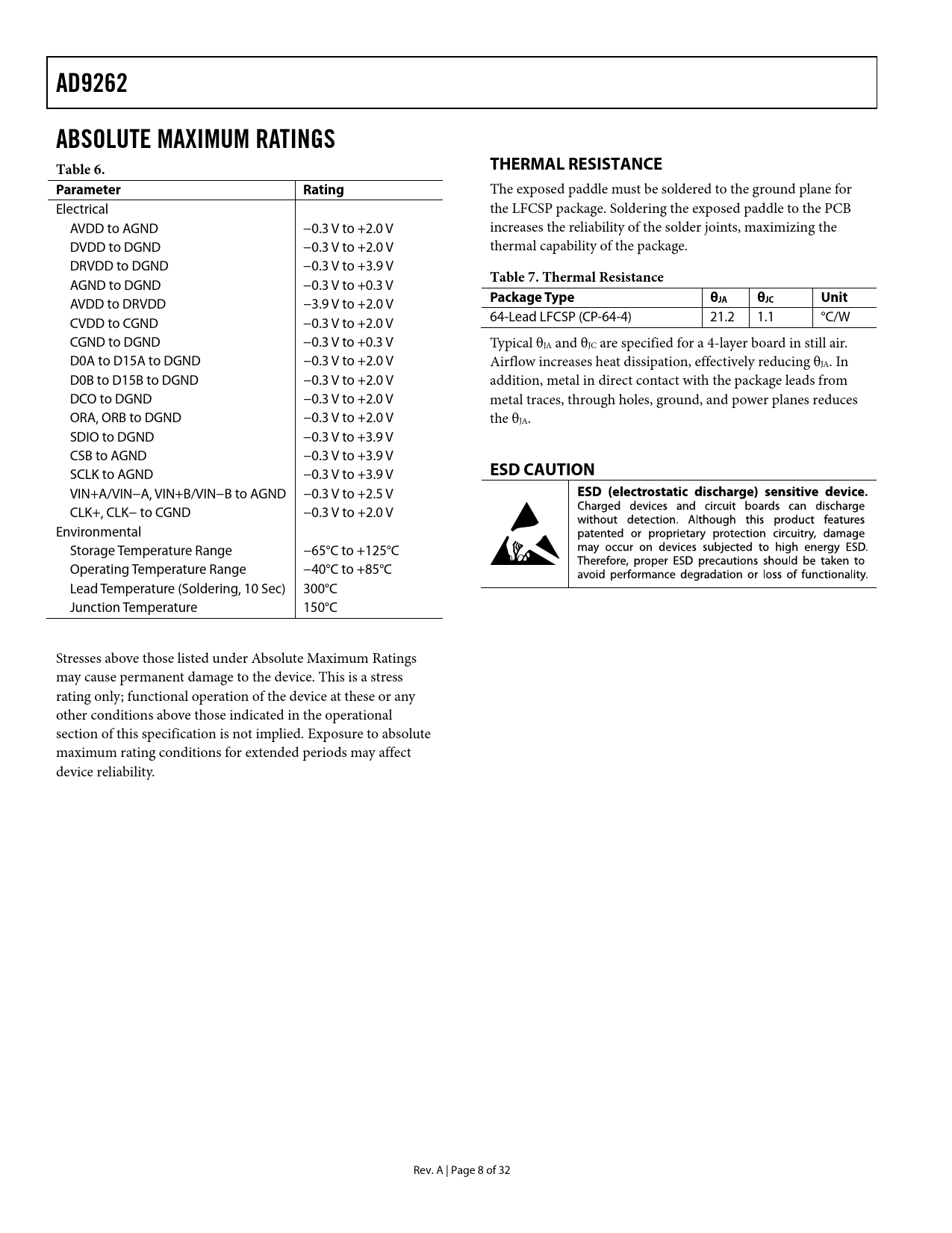 AD9262ABSOLUTE MAXIMUM RATINGS Table 6.THERMAL RESISTANCEParameter Rating The exposed paddle must be soldered to the ground plane for Electrical the LFCSP package. Soldering the exposed paddle to the PCB AVDD to AGND −0.3 V to +2.0 V increases the reliability of the solder joints, maximizing the DVDD to DGND −0.3 V to +2.0 V thermal capability of the package. DRVDD to DGND −0.3 V to +3.9 V Table 7. Thermal Resistance AGND to DGND −0.3 V to +0.3 V Package Typeθ AVDD to DRVDD −3.9 V to +2.0 V JAθJC Unit CVDD to CGND −0.3 V to +2.0 V 64-Lead LFCSP (CP-64-4) 21.2 1.1 °C/W CGND to DGND −0.3 V to +0.3 V Typical θJA and θJC are specified for a 4-layer board in still air. D0A to D15A to DGND −0.3 V to +2.0 V Airflow increases heat dissipation, effectively reducing θJA. In D0B to D15B to DGND −0.3 V to +2.0 V addition, metal in direct contact with the package leads from DCO to DGND −0.3 V to +2.0 V metal traces, through holes, ground, and power planes reduces ORA, ORB to DGND −0.3 V to +2.0 V the θJA. SDIO to DGND −0.3 V to +3.9 V CSB to AGND −0.3 V to +3.9 V SCLK to AGND −0.3 V to +3.9 V ESD CAUTION VIN+A/VIN−A, VIN+B/VIN−B to AGND −0.3 V to +2.5 V CLK+, CLK− to CGND −0.3 V to +2.0 V Environmental Storage Temperature Range −65°C to +125°C Operating Temperature Range −40°C to +85°C Lead Temperature (Soldering, 10 Sec) 300°C Junction Temperature 150°C Stresses above those listed under Absolute Maximum Ratings may cause permanent damage to the device. This is a stress rating only; functional operation of the device at these or any other conditions above those indicated in the operational section of this specification is not implied. Exposure to absolute maximum rating conditions for extended periods may affect device reliability. Rev. A | Page 8 of 32 Document Outline Features Applications General Description Functional Block Diagram Product Highlights Revision History Specifications DC Specifications AC Specifications Digital Decimation Filtering Characteristics Digital Specifications Switching Specifications Timing Diagram Absolute Maximum Ratings Thermal Resistance ESD Caution Pin Configuration and Function Descriptions Typical Performance Characteristics AD9262BCPZ AD9262BCPZ-5 AD9262BCPZ-10 Equivalent Circuits Theory of Operation Analog Input Considerations Input Common Mode Differential Input Configurations Voltage Reference Internal Reference Connection External Reference Operation Clock Input Considerations Direct Clocking Internal PLL Clock Distribution PLL Autoband Select Jitter Considerations Power Dissipation and Standby Mode Digital Engine Bandwidth Selection Decimation Filters Sample Rate Converter Cascaded Filter Responses DC and Quadrature Error Correction (QEC) LO Leakage (DC) Correction QEC and DC Correction Range Digital Outputs Digital Output Format Interleaved Outputs Overrange (OR) Condition Timing Serial Port Interface (SPI) Configuration Using the SPI Hardware Interface Applications Information Filtering Requirement Memory Map Memory Map Definitions Outline Dimensions Ordering Guide