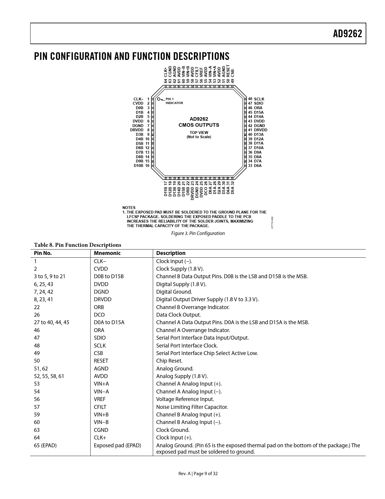 AD9262. PIN CONFIGURATION AND FUNCTION DESCRIPTIONS. CLK– 1. PIN 1. 48 SCLK. INDICATOR. CVDD 2. 47 SDIO. D0B 3. 46 ORA. D1B 4. 45 D15A. D2B 5