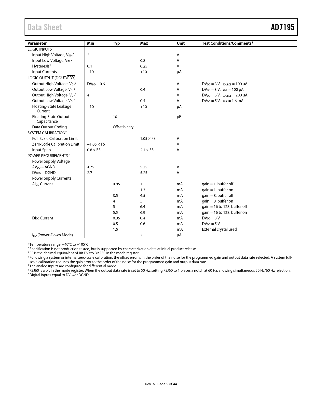 Data Sheet. AD7195. Parameter. Min. Typ. Max. Unit. Test Conditions/Comments1